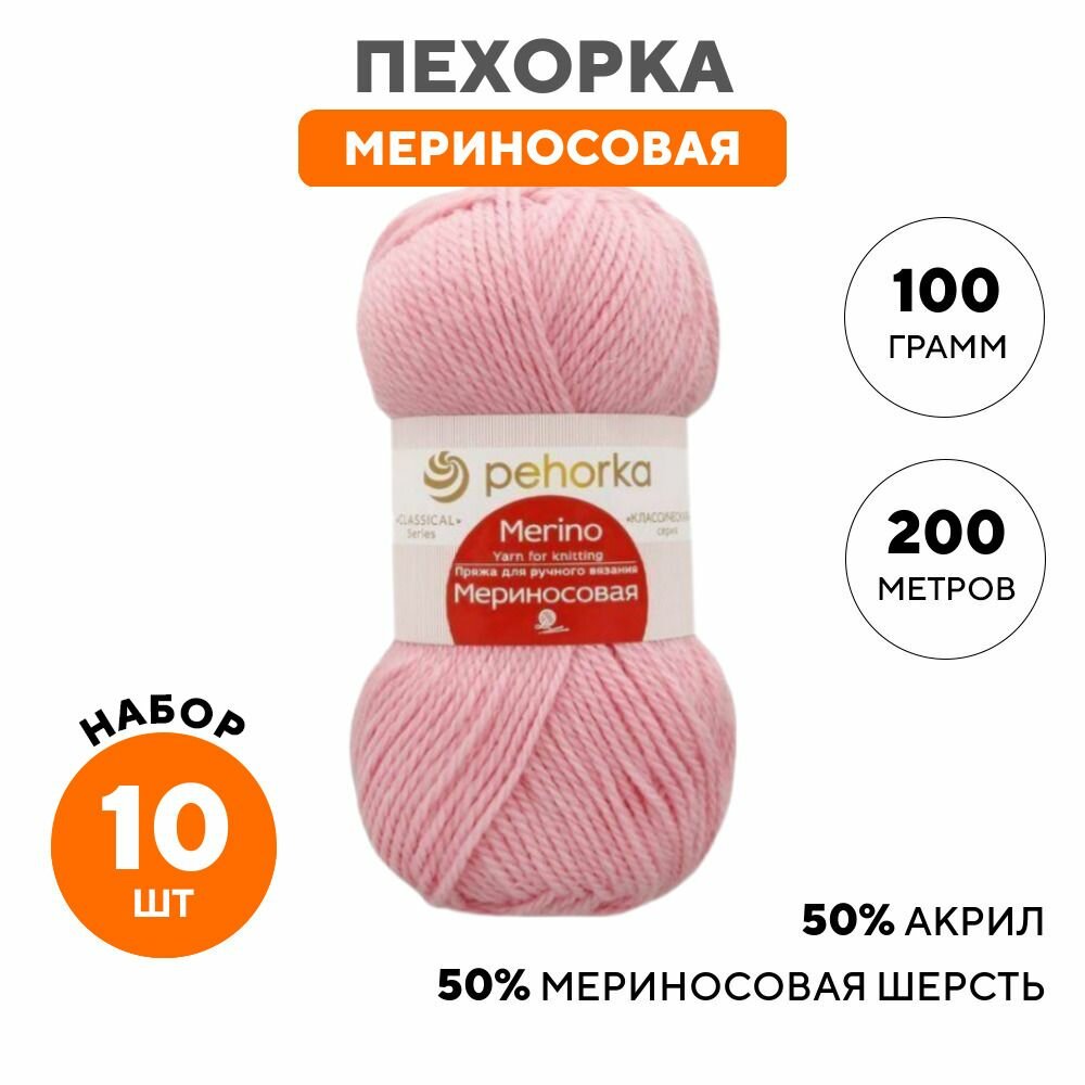 Пряжа для вязания Пехорка 'Мериносовая' 100г, 200м (50% шерсть, 50% акрил) (89 фрез), 10 мотков