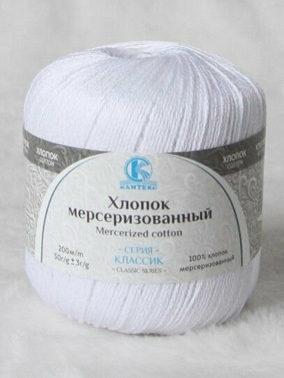 Пряжа Камтекс Хлопок мерсеризованный отбелка (002), 100%мерсеризованный хлопок, 200м, 50г, 1шт