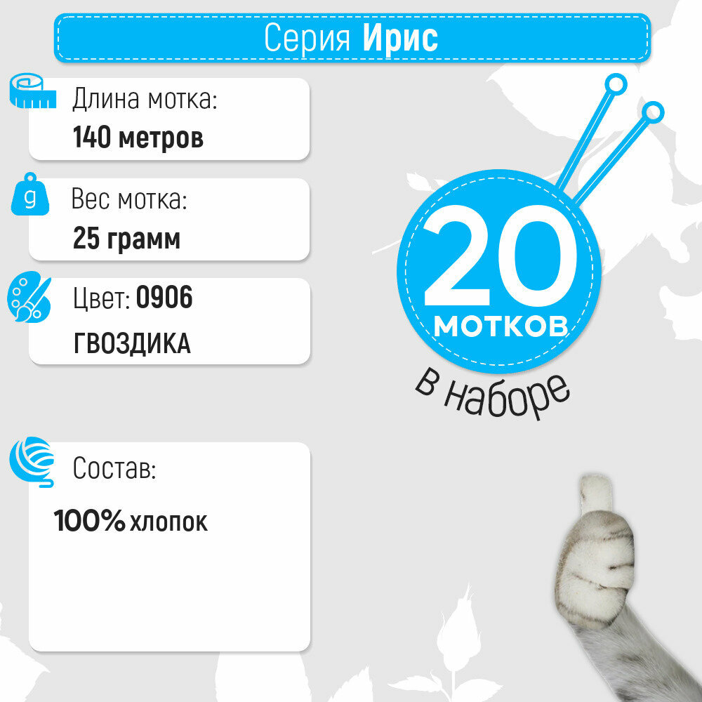 Нитки для вязания и плетения 'ирис' (100% хлопок), 25г, 150м (7206 серый), 20 мотков