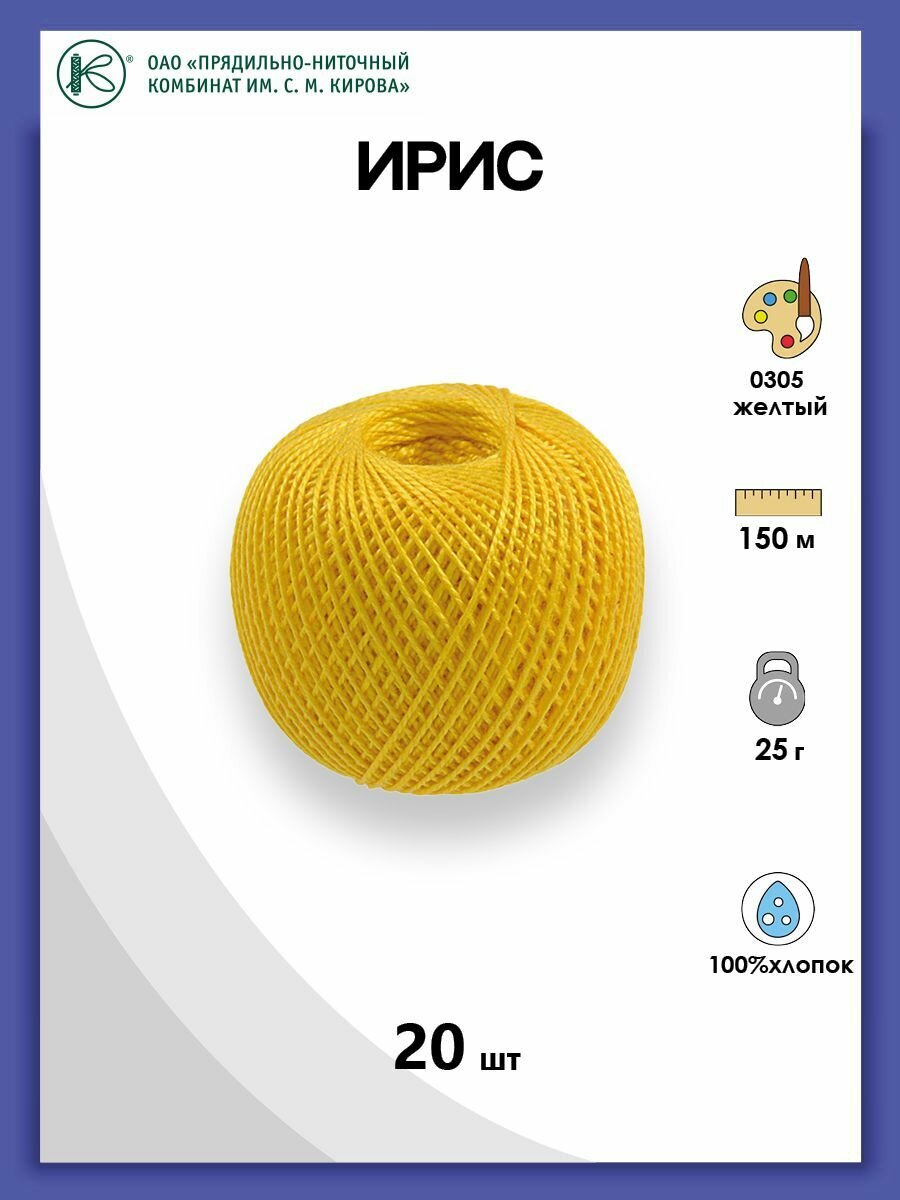Купить Нитки для вязания и плетения 'ирис' (100% хлопок), 25г, 150м (0305 желтый), 20 мотков