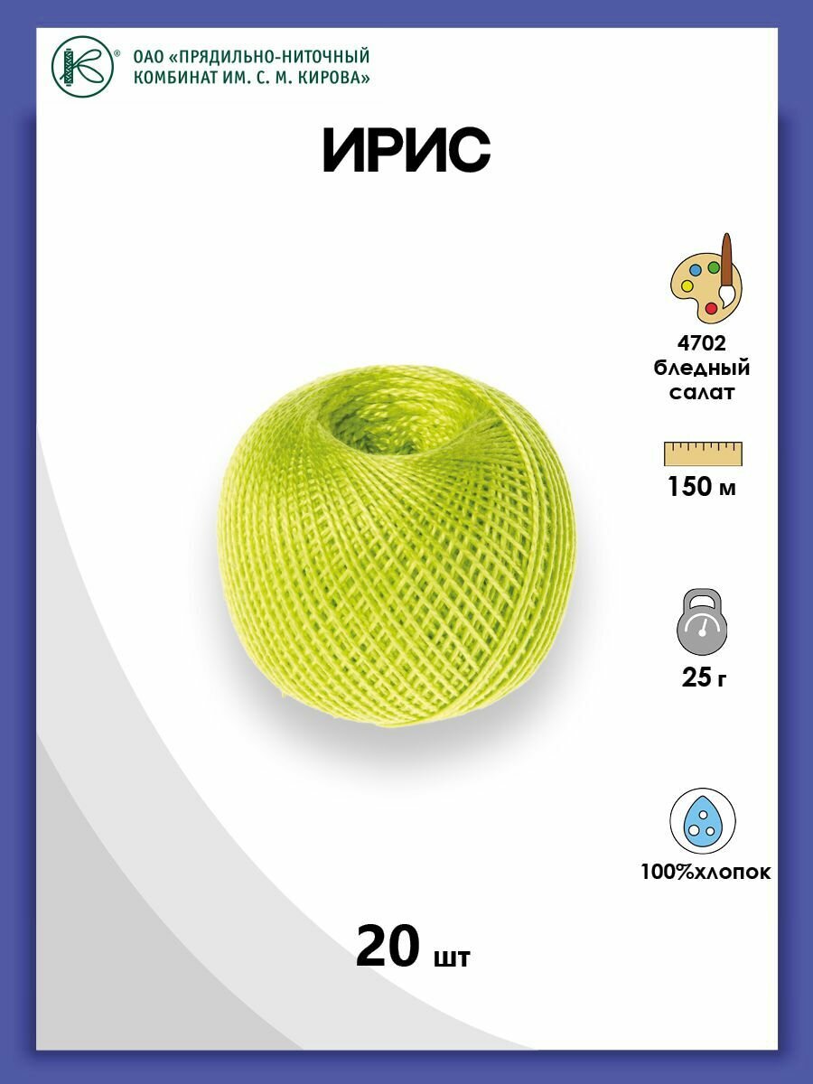 Купить Нитки для вязания и плетения 'ирис' (100% хлопок), 25г, 150м (4702 бледный салат), 20 мотков