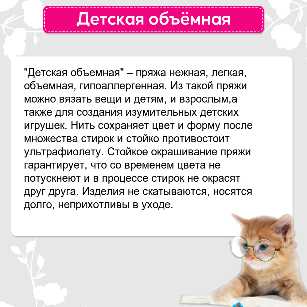 | Дополнительная информация | Подходит для вязания детских комплектов 'шапочка и шарф', пинеточек, кардиганов, свитеров, жилеток, а также мягких игрушек амигуруми. |