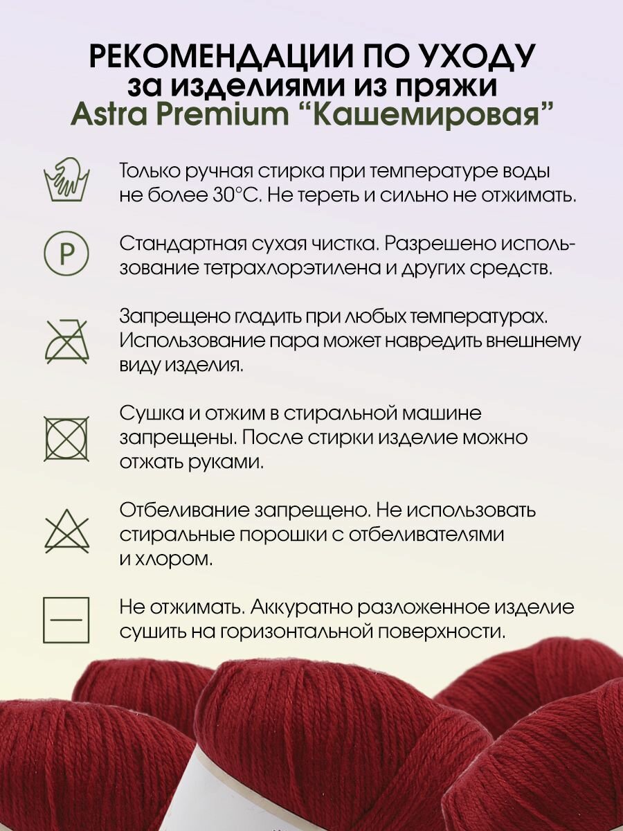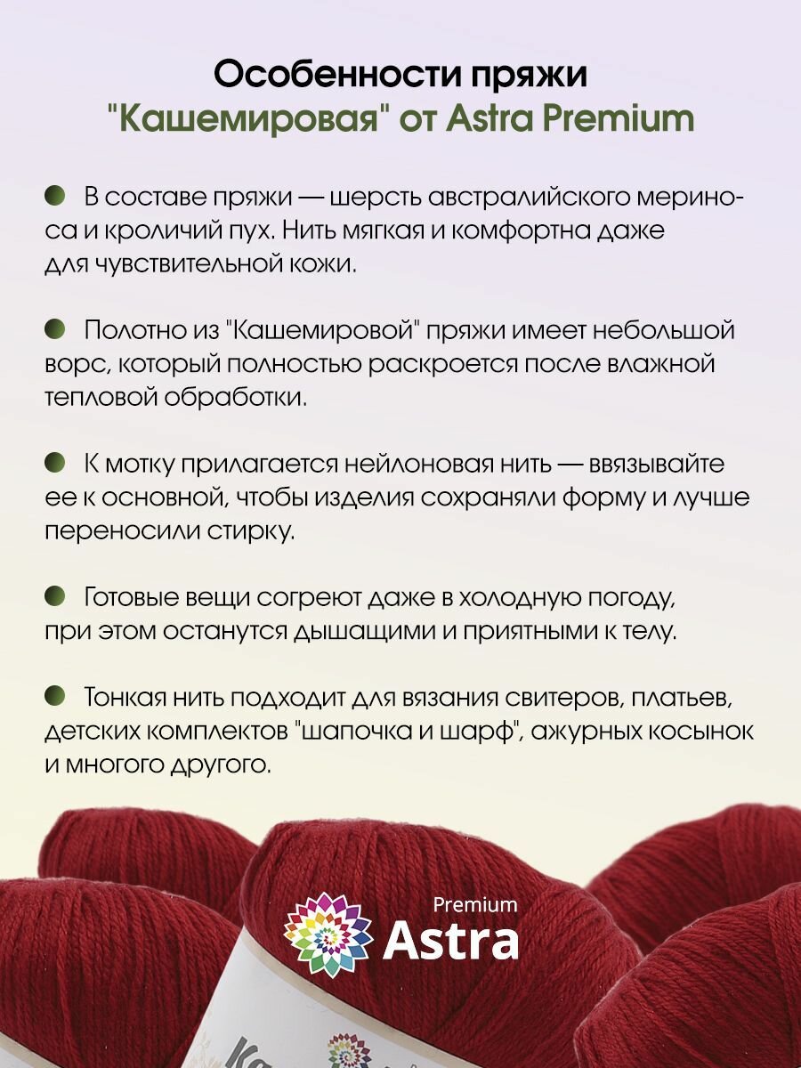 СохранитьПряжа для вязания Astra Premium 'Кашемировая' (Cashmere), 50г, 310м (20% кроличий пух, 30% австралийский меринос, 50% нейлон) + нить 20г (162 красный) интересное:
