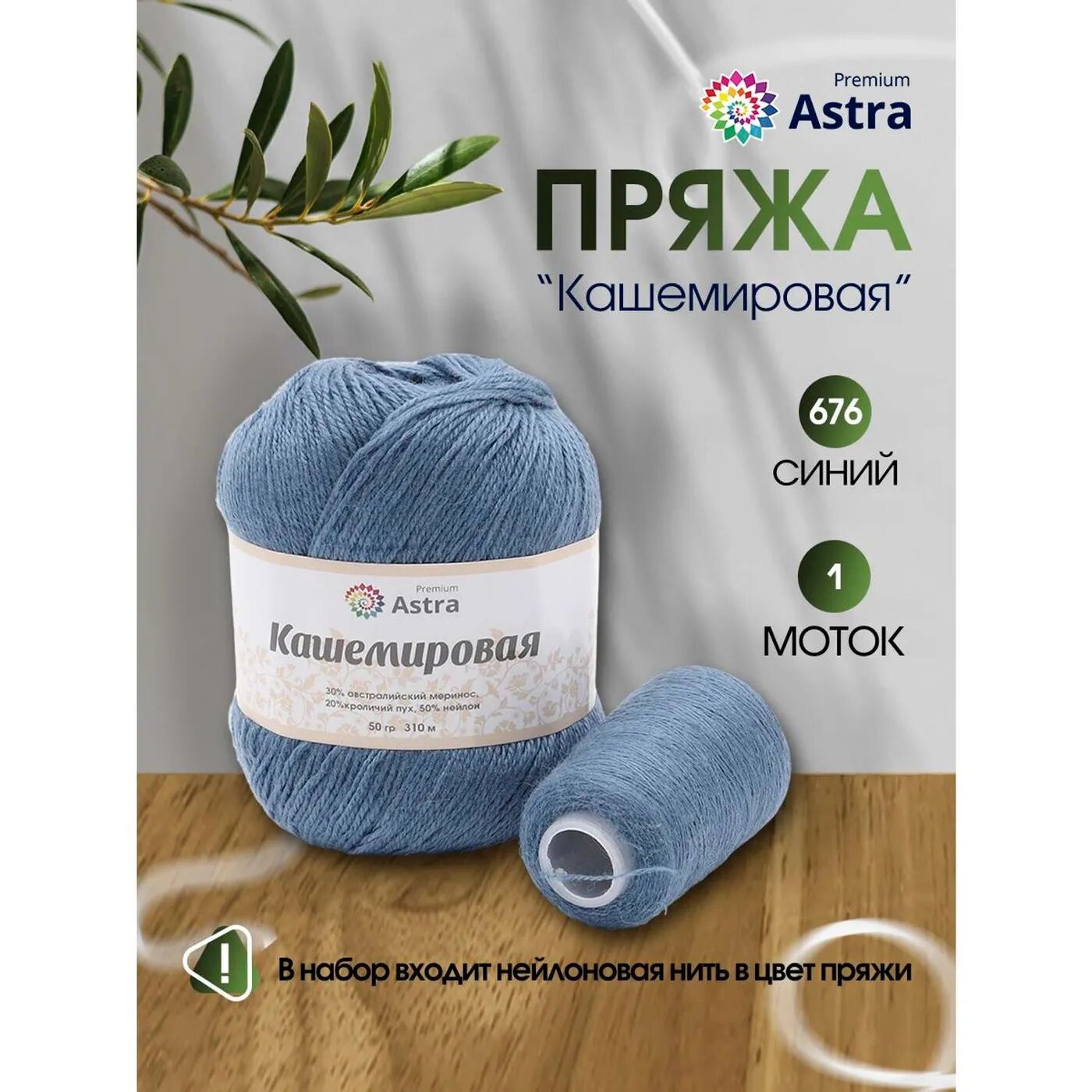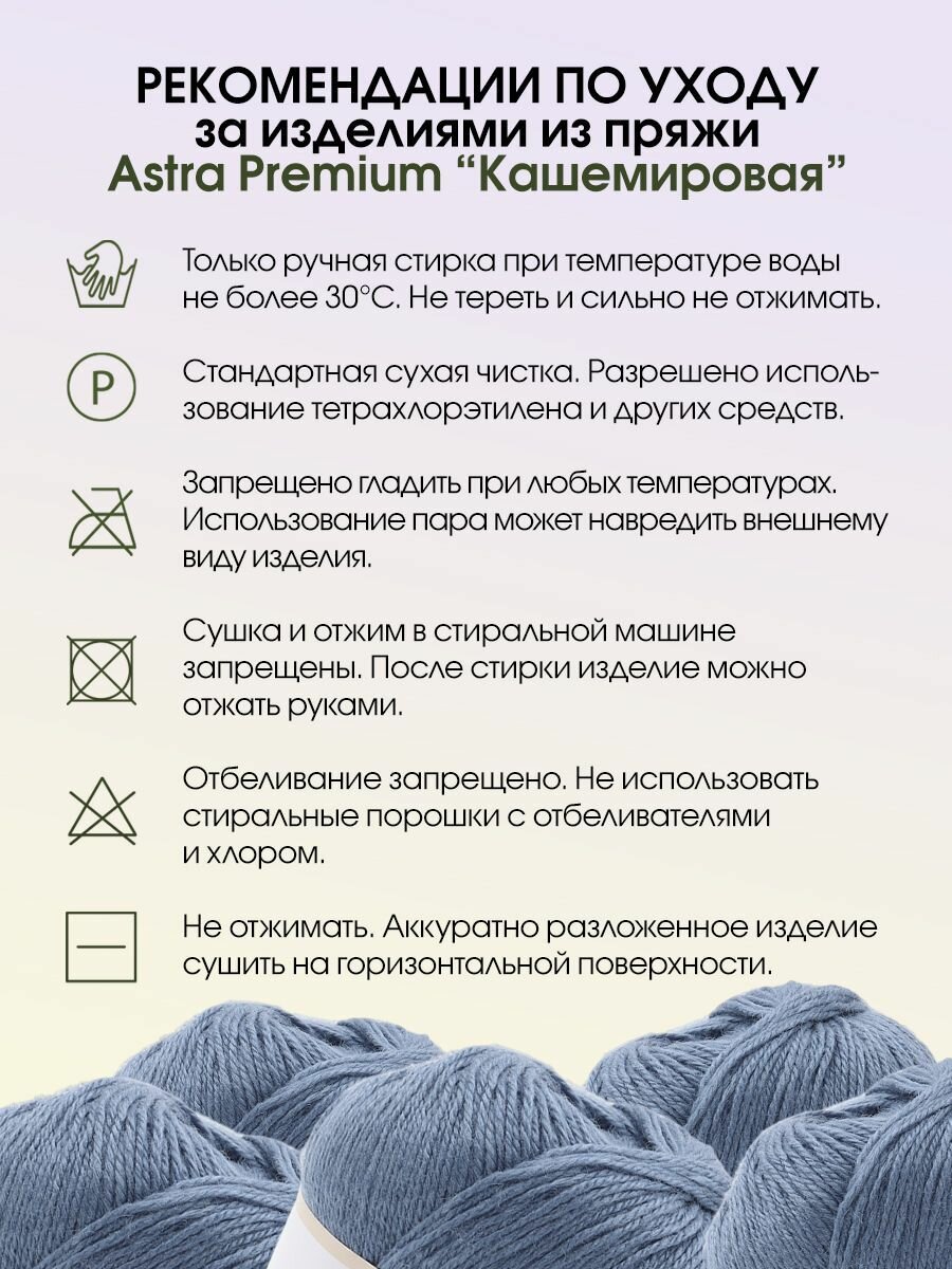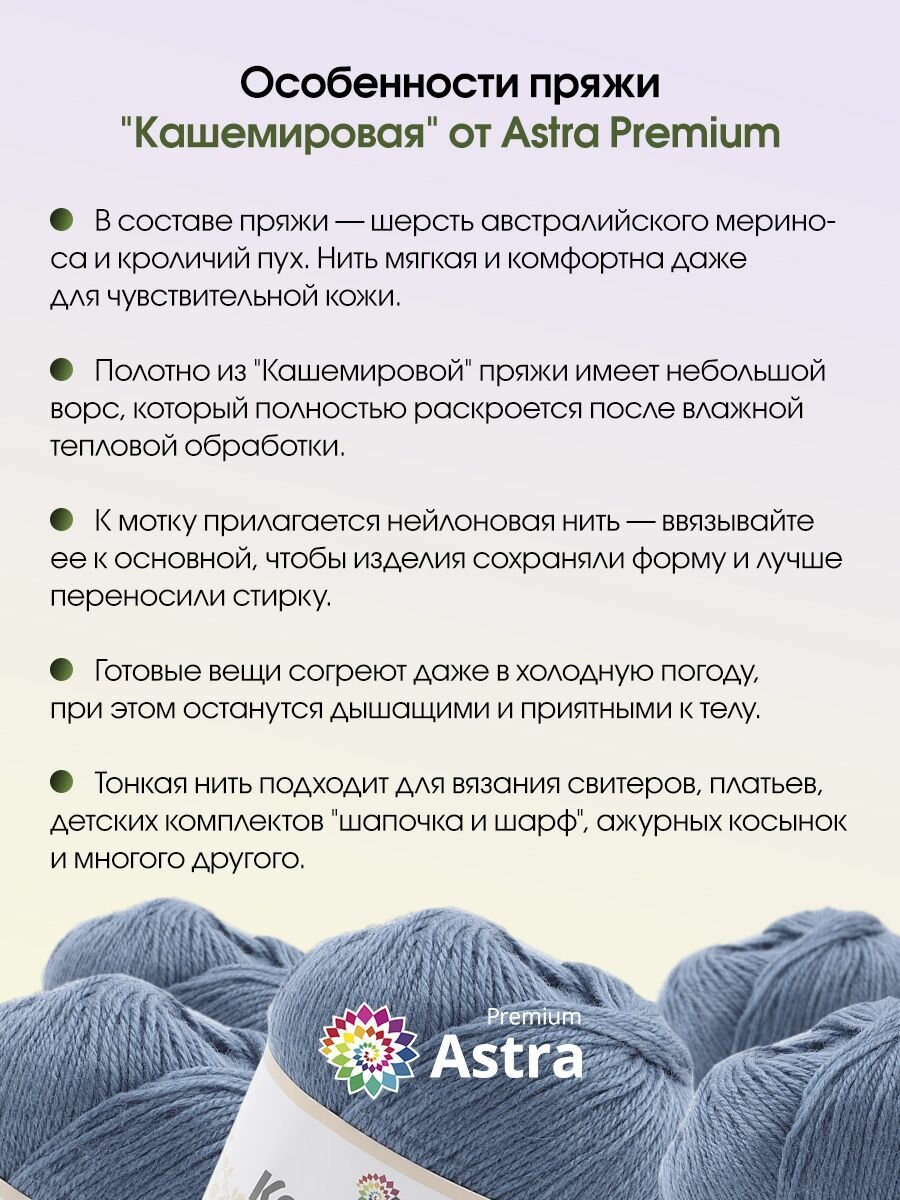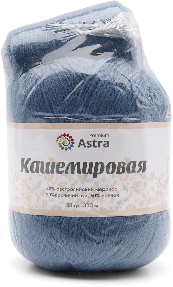 СохранитьПряжа для вязания Astra Premium 'Кашемировая' (Cashmere), 50г, 310м (20% кроличий пух, 30% австралийский меринос, 50% нейлон) + нить 20г (676 синий) интересное: