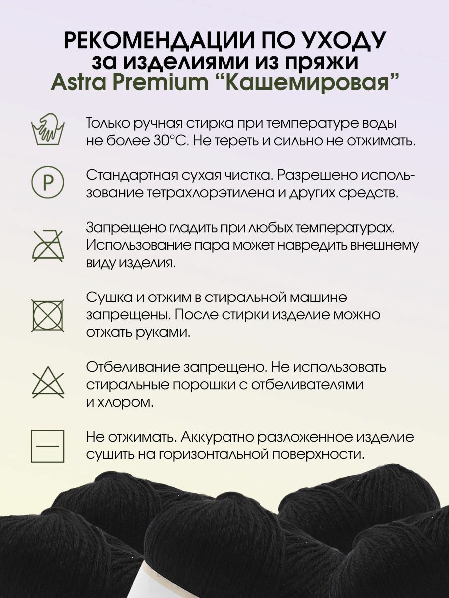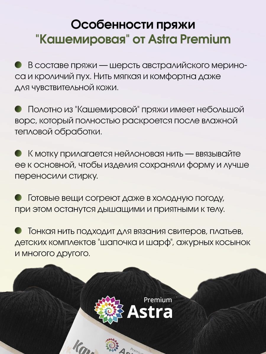 СохранитьПряжа для вязания Astra Premium 'Кашемировая' (Cashmere), 50г, 310м (20% кроличий пух, 30% австралийский меринос, 50% нейлон) + нить 20г (999 черный) интересное: