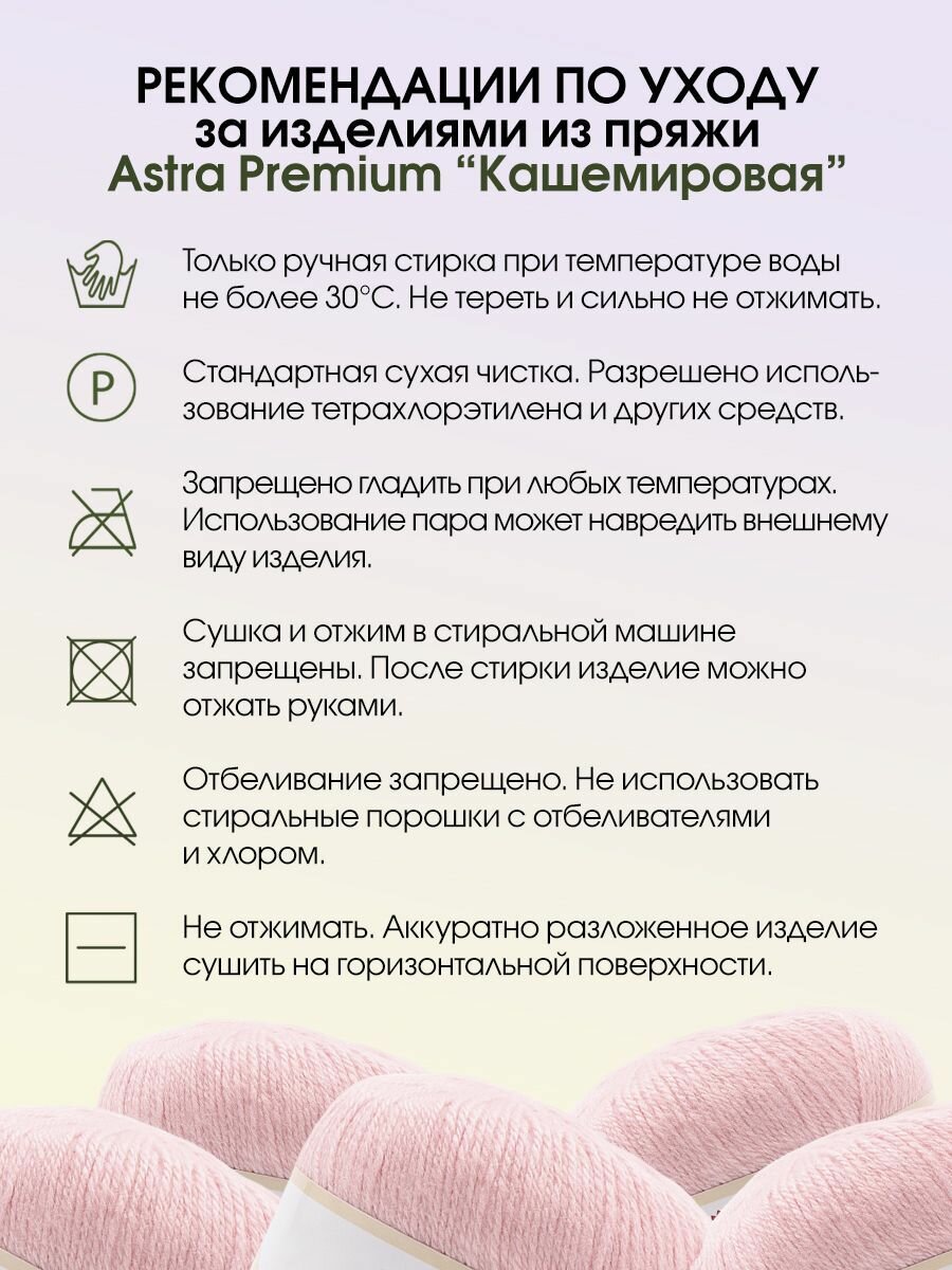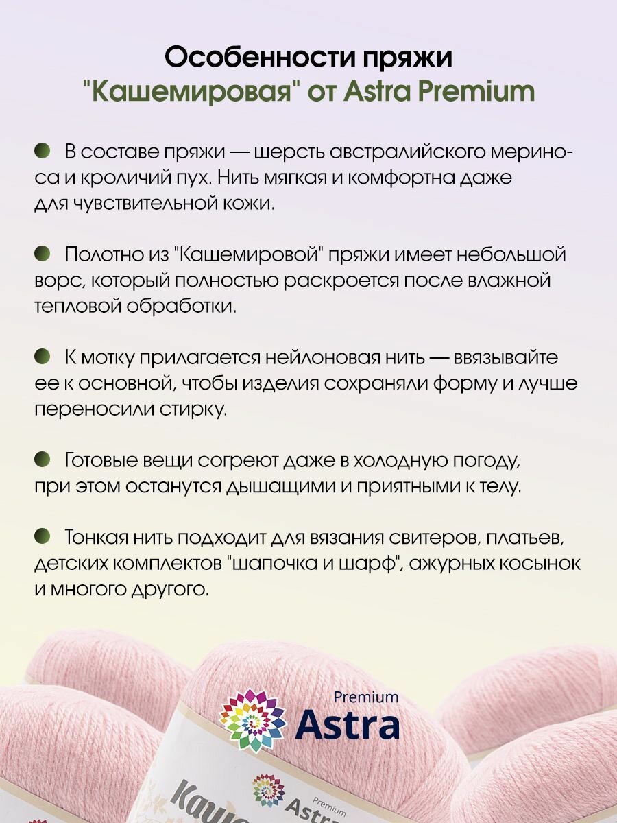 СохранитьПряжа для вязания Astra Premium 'Кашемировая' (Cashmere), 50г, 310м (20% кроличий пух, 30% австралийский меринос, 50% нейлон) + нить 20г (114 светло-розовый) интересное: