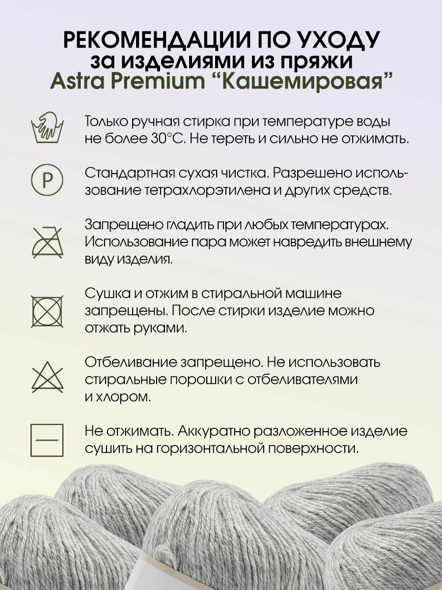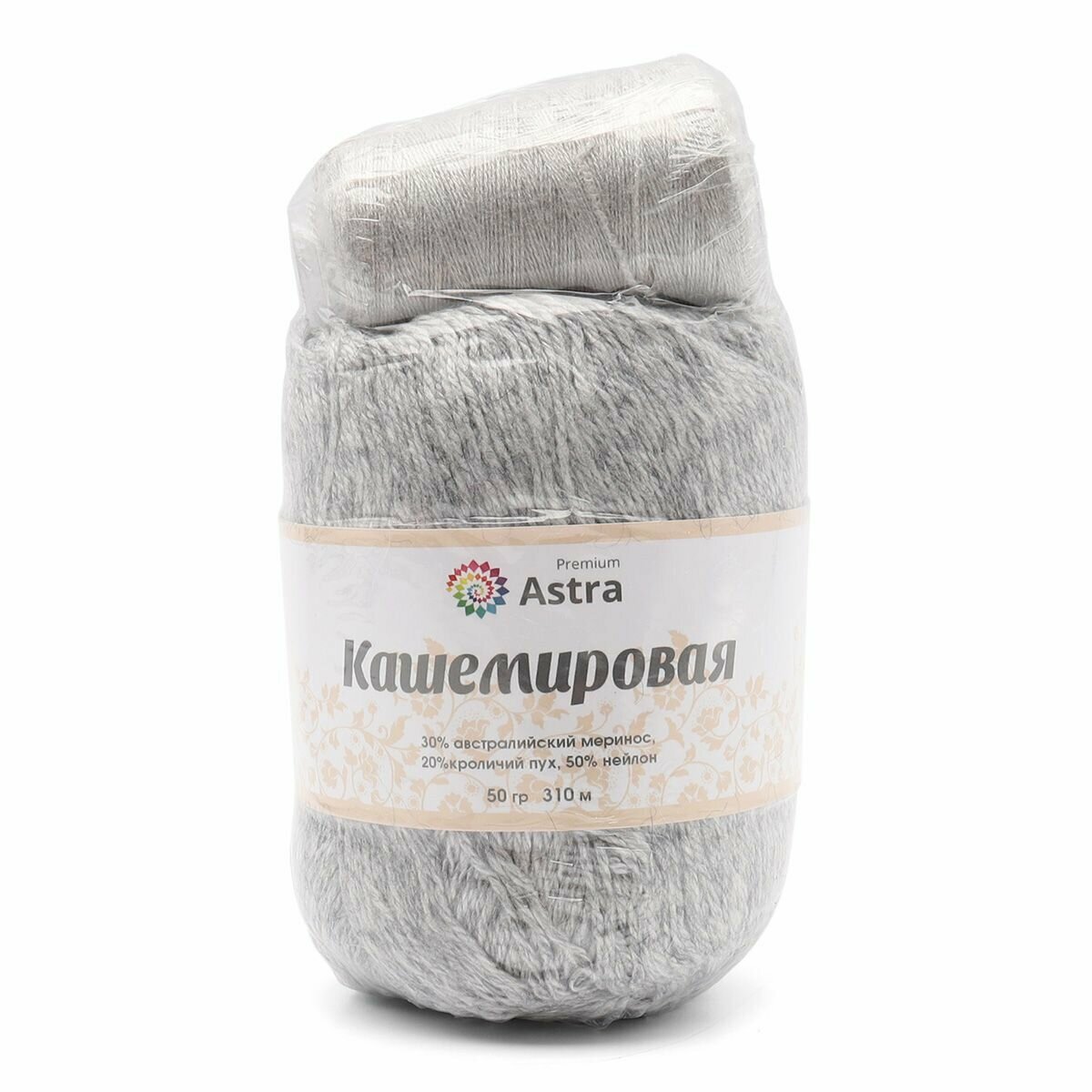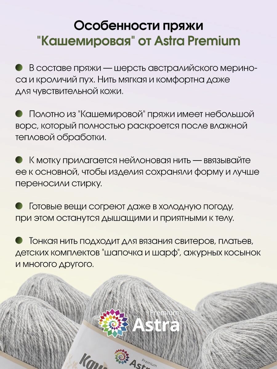 СохранитьПряжа для вязания Astra Premium 'Кашемировая' (Cashmere), 50г, 310м (20% кроличий пух, 30% австралийский меринос, 50% нейлон) + нить 20г (932 светло-серый) интересное: