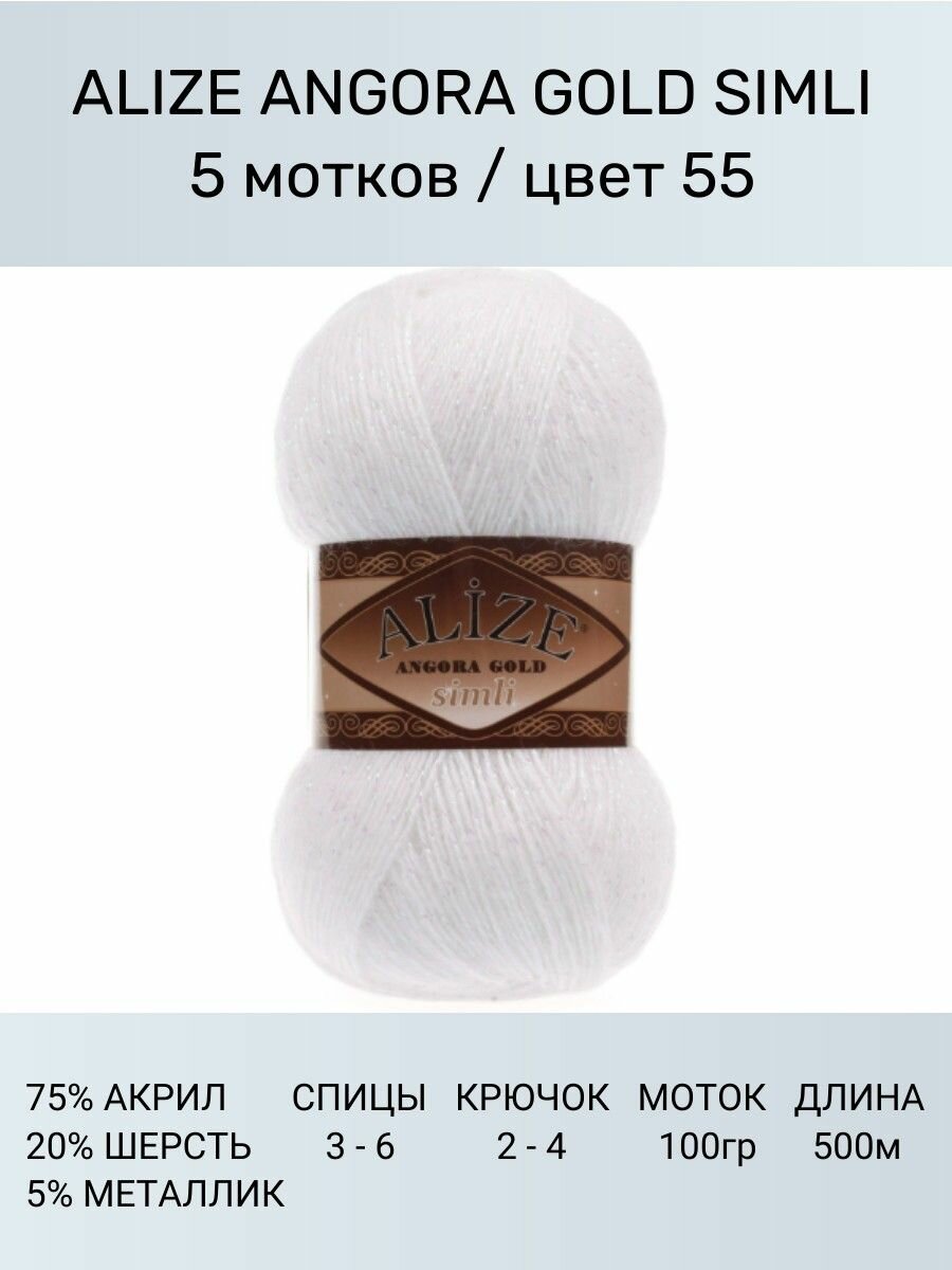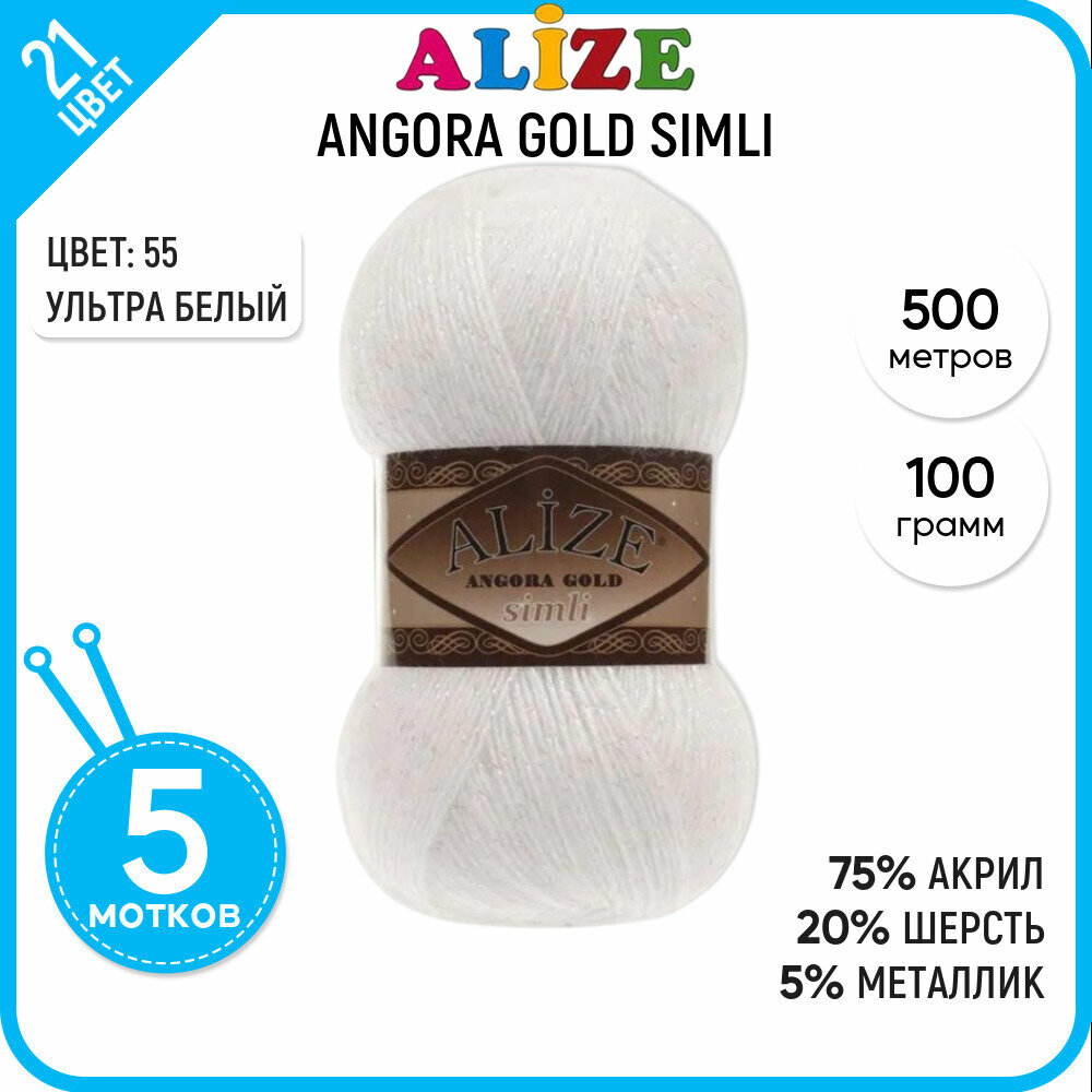 Пряжа для вязания ALIZE Angora Gold Simli Ализе Ангора Голд: 55 (белый), 5 шт 500 м 100 г, 5% металлик, 20% шерсть, 75% акрил