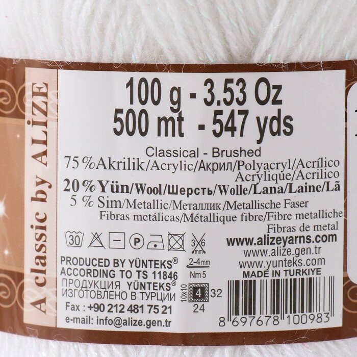 Пряжа Alize Angora Gold simli белый (55), 75%акрил/20%шерсть/5%метанит, 500м, 100г, 1шт