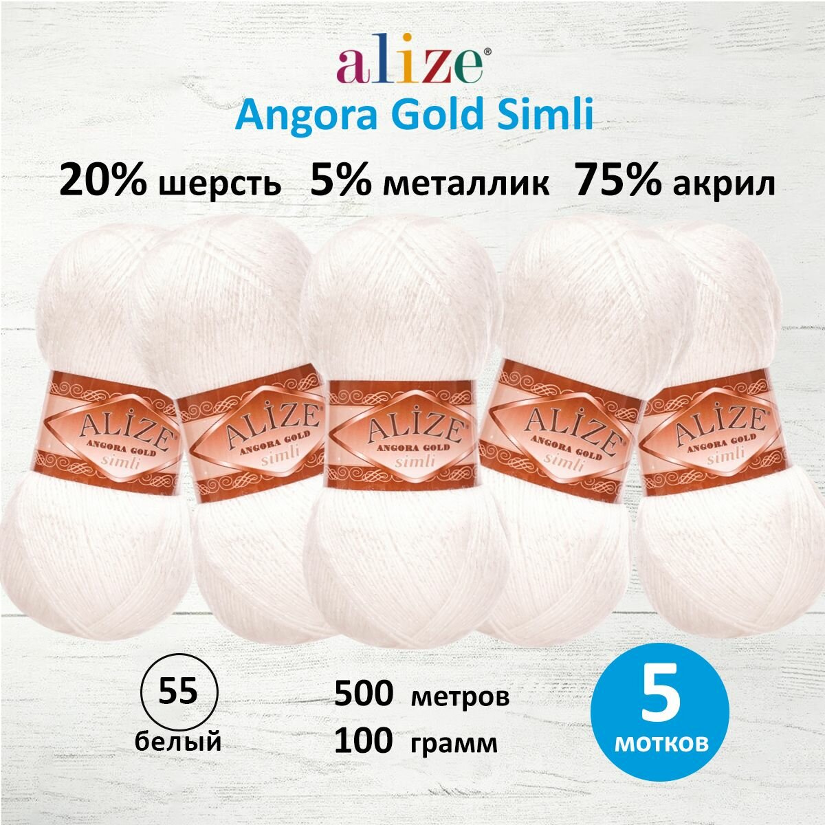 Пряжа ALIZE ANGORA GOLD SIMLI, молочный - 62, 5% металлик, 20% шерсть, 75% акрил, 5 мотков, 100 г, 500 м.