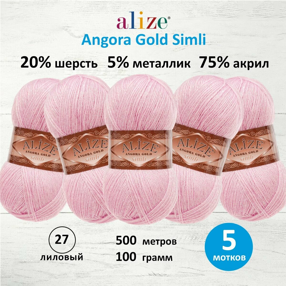 Пряжа для вязания ALIZE 'Angora Gold Simli', 100г, 500м (шерсть, металлик, акрил) (28 роза), 5 мотков