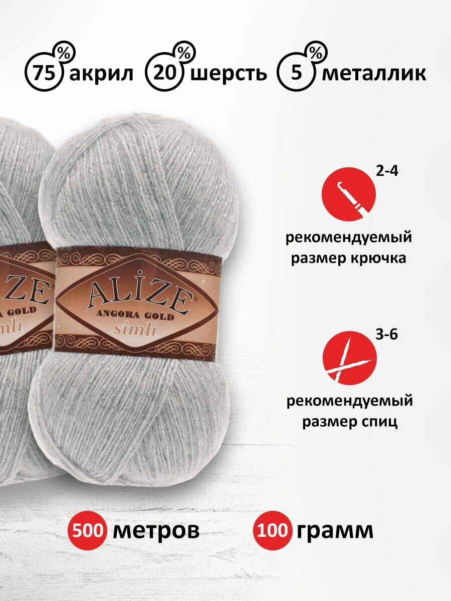 Пряжа для вязания ALIZE Angora Gold Simli Ализе Ангора Голд: 21 (серый), 4 шт 500 м 100 г, 5% металлик, 20% шерсть, 75% акрил
