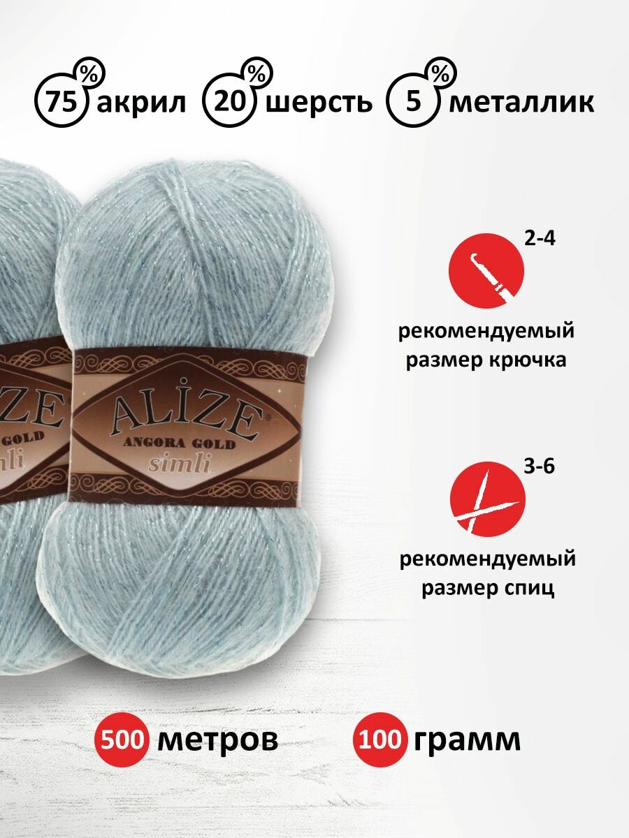 Пряжа ALIZE ANGORA GOLD SIMLI, светлый джинс - 221, 5% металлик, 20% шерсть, 75% акрил, 5 мотков, 100 г, 500 м.