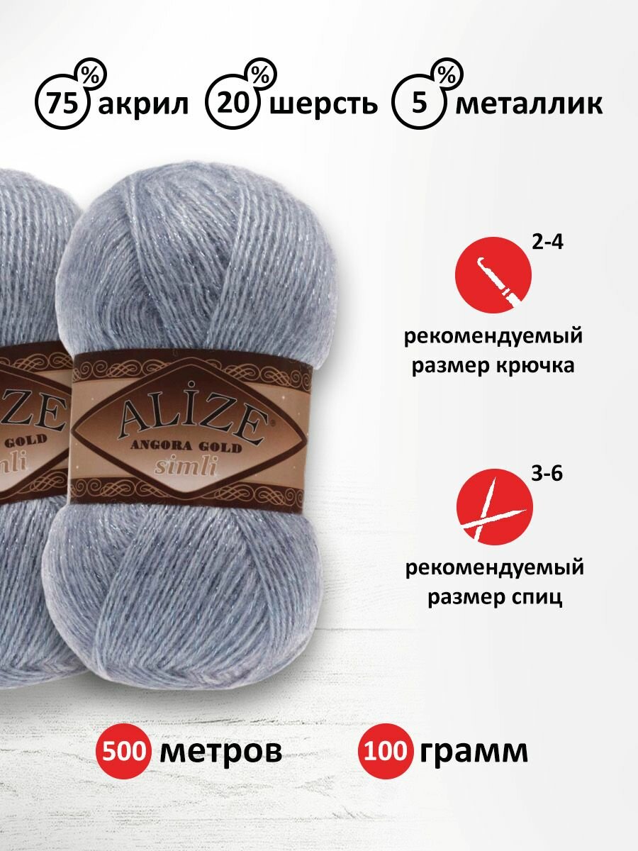 Пряжа для вязания ALIZE Angora Gold Simli Ализе Ангора Голд: 21 (серый), 4 шт 500 м 100 г, 5% металлик, 20% шерсть, 75% акрил