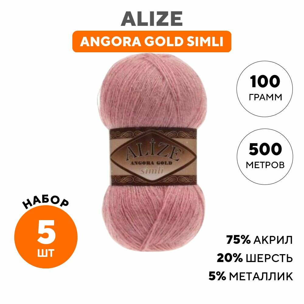 Купить Пряжа для вязания ALIZE 'Angora Gold Simli', 100г, 500м (20% шерсть, 5% металлик, 75% акрил) (144 темная пудра), 5 мотков