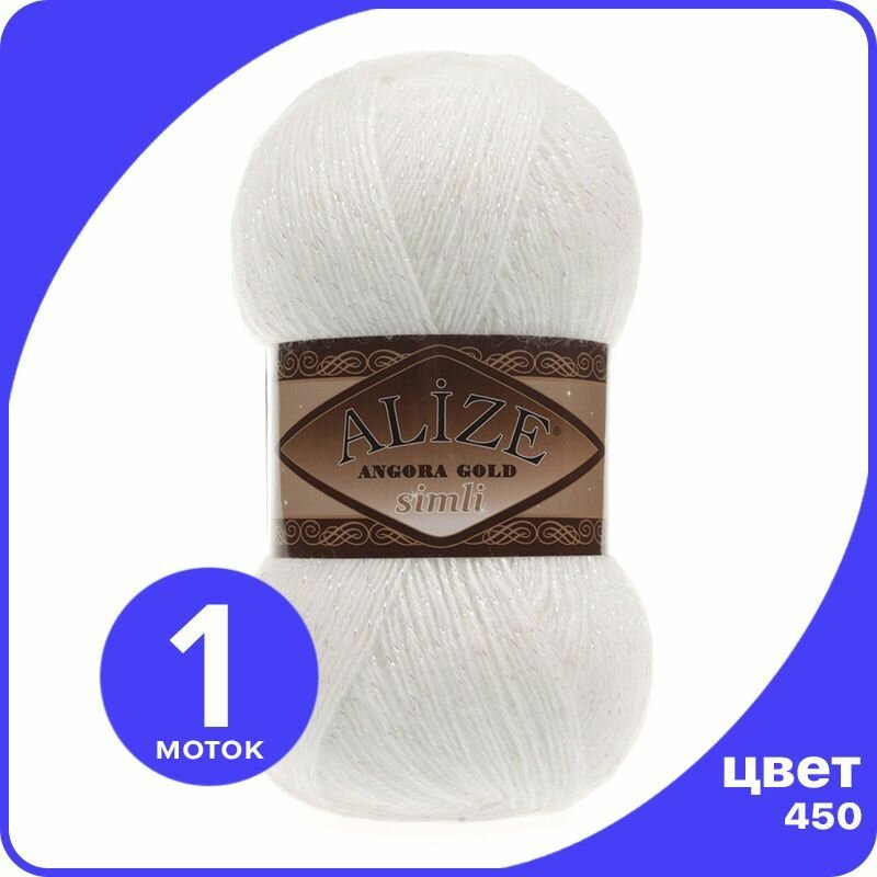 Пряжа ALIZE ANGORA GOLD SIMLI, молочный - 62, 5% металлик, 20% шерсть, 75% акрил, 5 мотков, 100 г, 500 м.