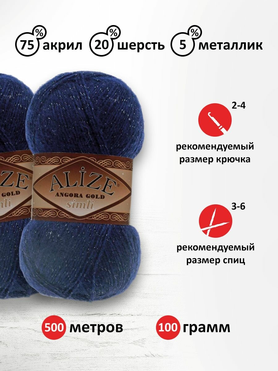 Купить Пряжа для вязания ALIZE 'Angora Gold Simli', 100г, 500м (20% шерсть, 5% металлик, 75% акрил) (58 тёмно-синий), 5 мотков