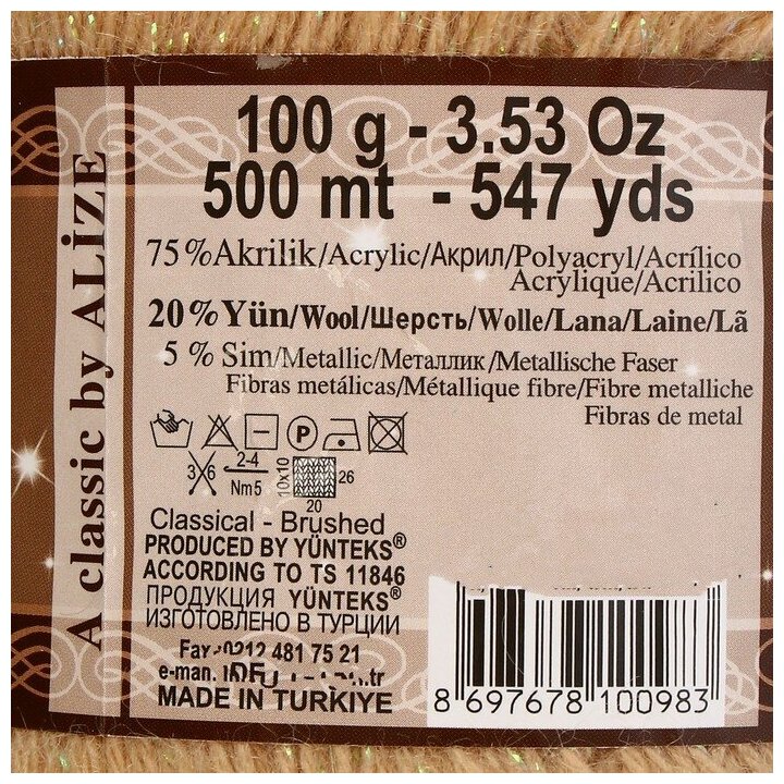 Пряжа Alize Angora Gold Simli, 20 % шерсть, 75 % акрил, 5 % люрекс, 100 г, 500 м, 1 шт, 404 шампань