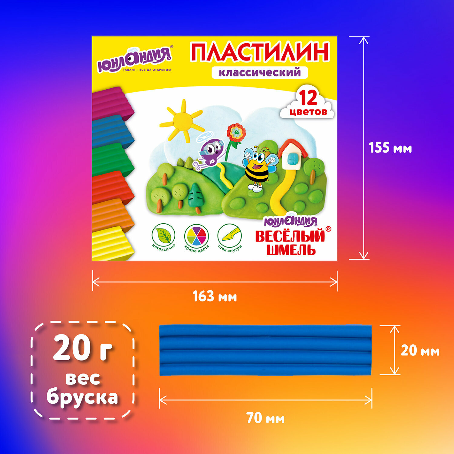Купить Пластилин классический Юнландия Весёлый Шмель, 12 цветов, 240 грамм, стек, Высшее Качество, 106431