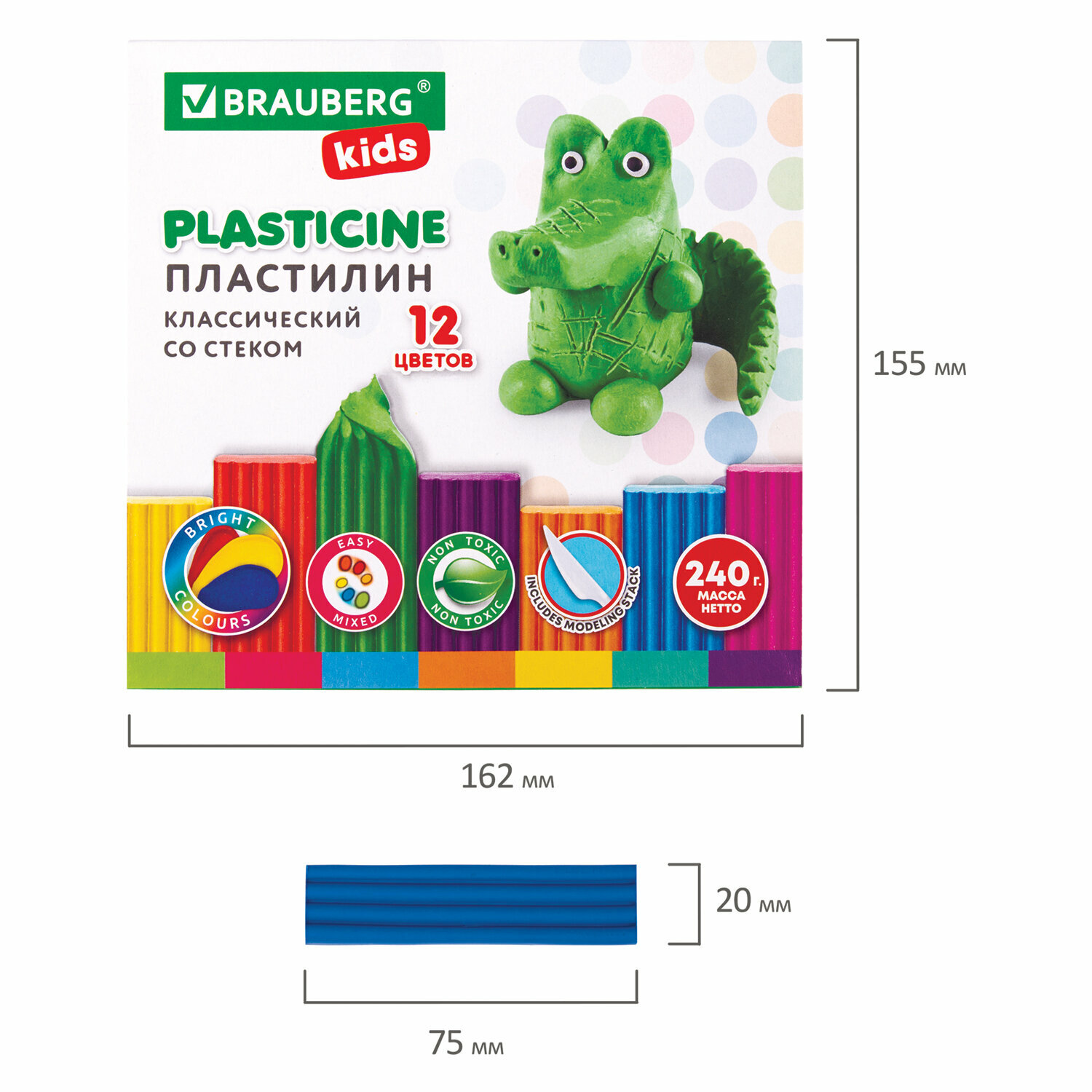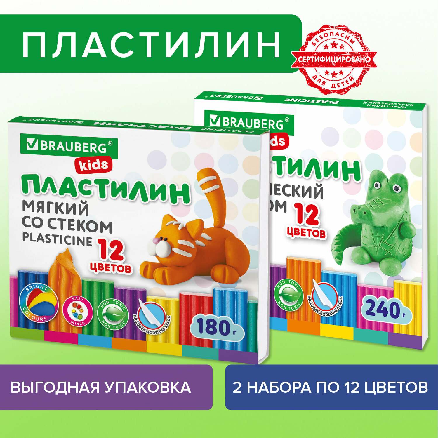 Купить Пластилин для лепки детский 2 набора по 12 цветов, мягкий классический в школу, 420 грамм, со стеком, Brauberg Kids, 880568