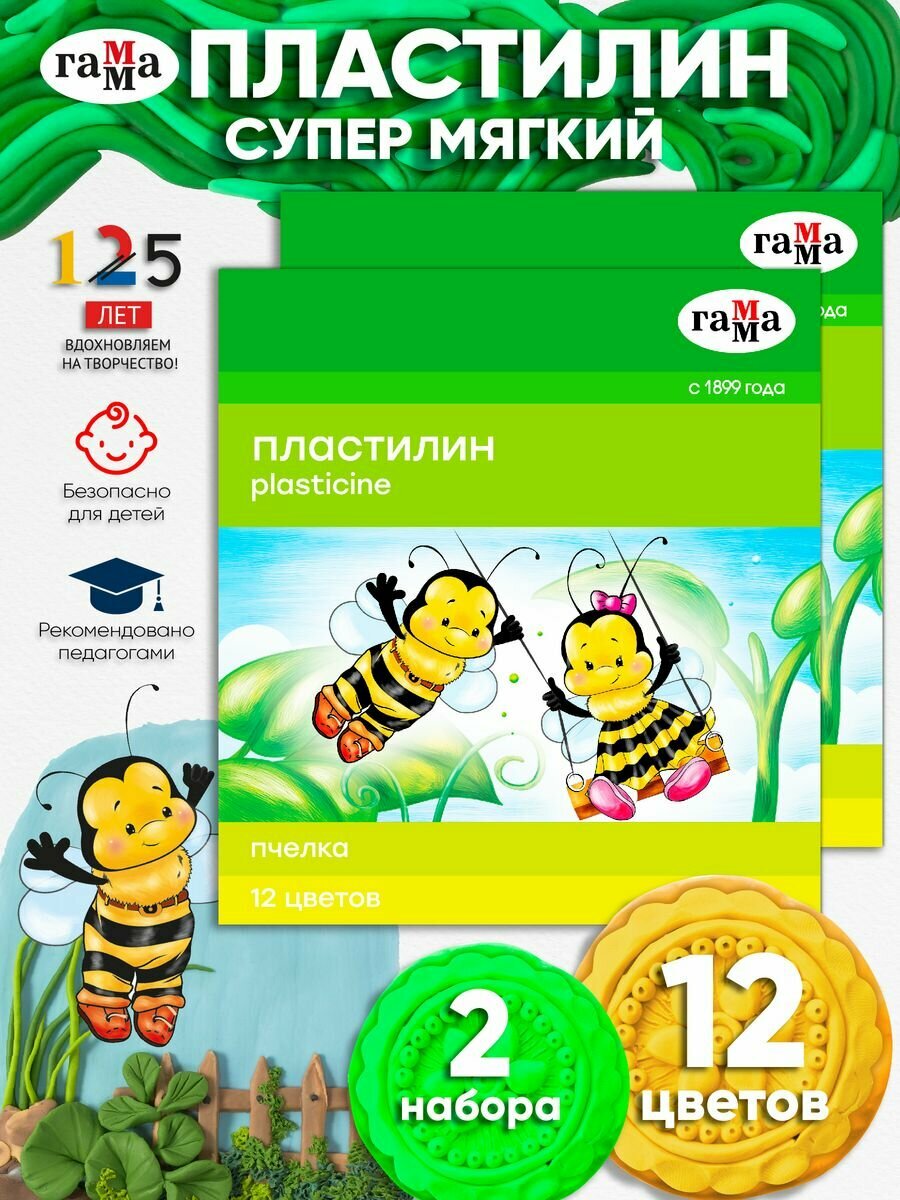 Купить Пластилин Гамма "Пчелка, 12 цветов, 180г, со стеком, картон. упаковка (2шт)