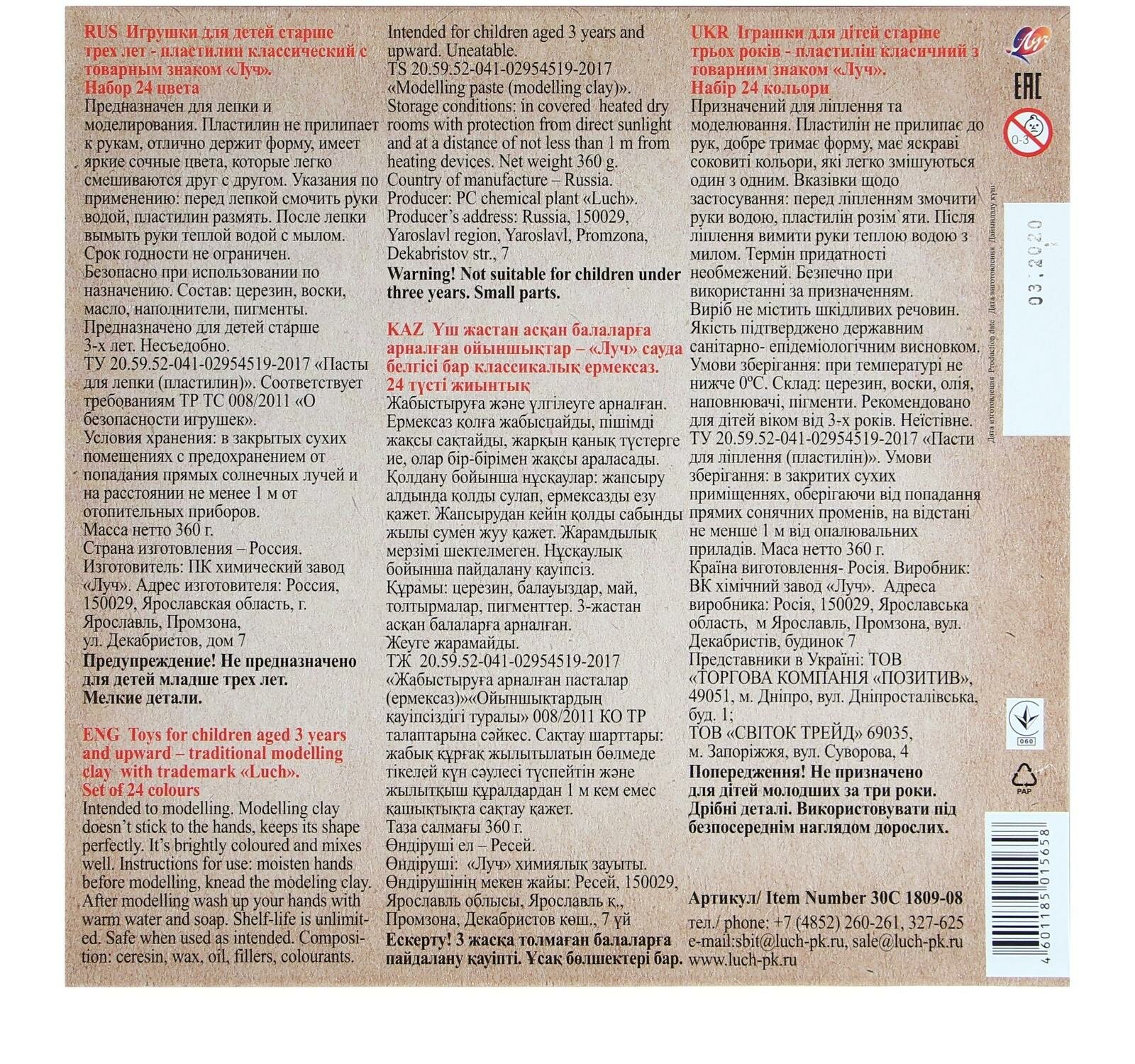 Пластилин классический Луч ZOO 24 цвета, 30С 1809-08