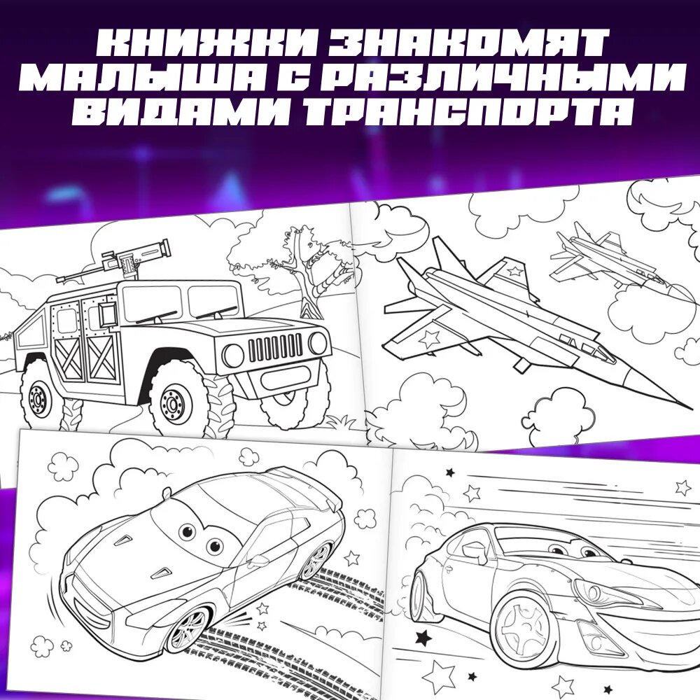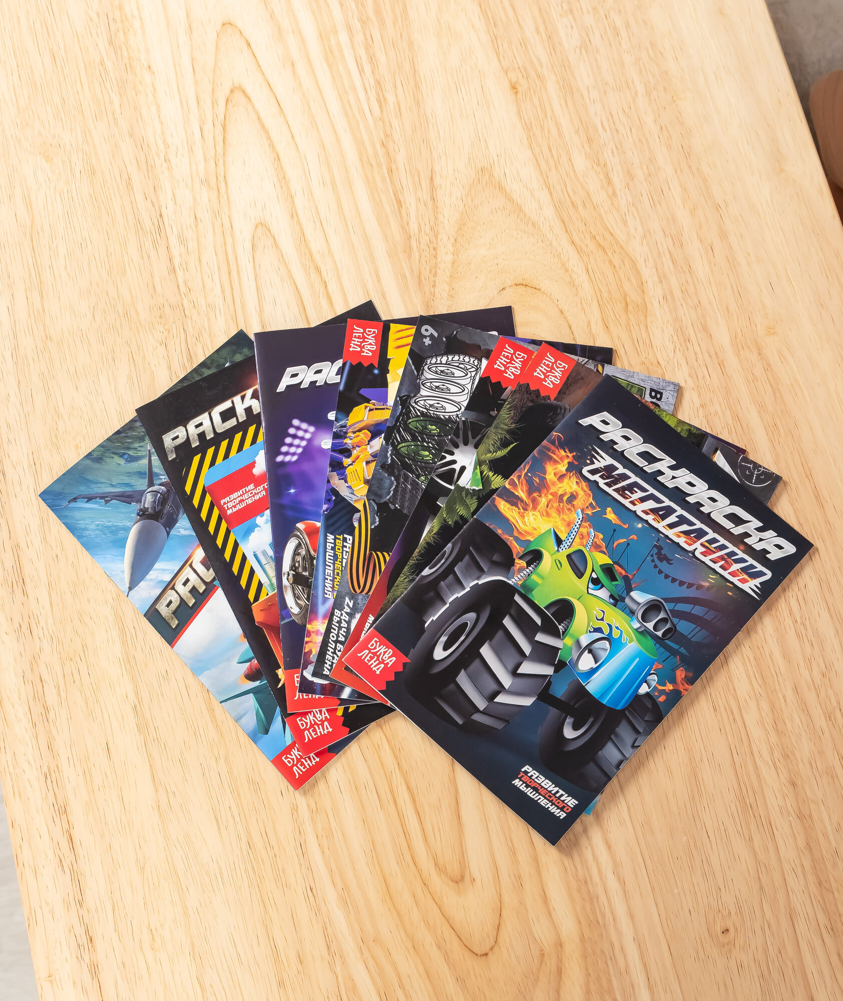 | Комплектация | Раскраска «Крутые гонки», Раскраска «Крутые мегатачки», Раскраска «Военные машины», Раскраска «Роботы», Раскраска «Мотоциклы», Раскраска «Стройтехника», Раскраска «Танки», Раскраска «Боевые самолеты» |