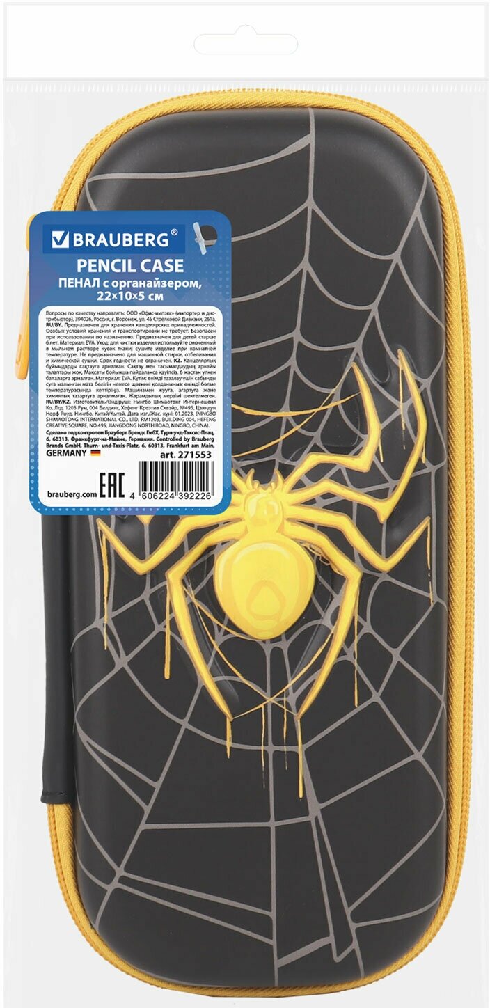 Купить Пенал-косметичка школьный для ручек, карандашей Brauberg, 1 отделение, 1 откидная планка, Eva, 22х10х5см, Venomous Spide, 271553