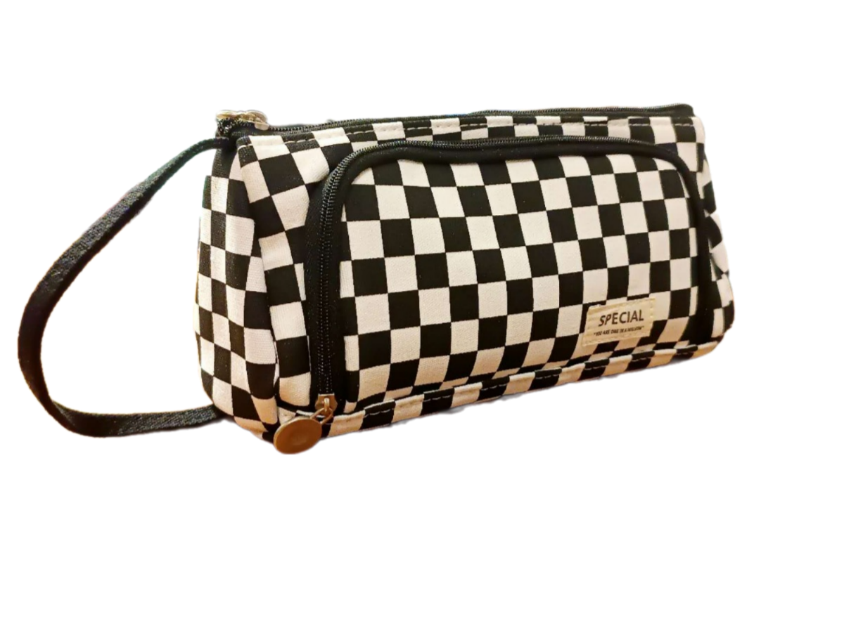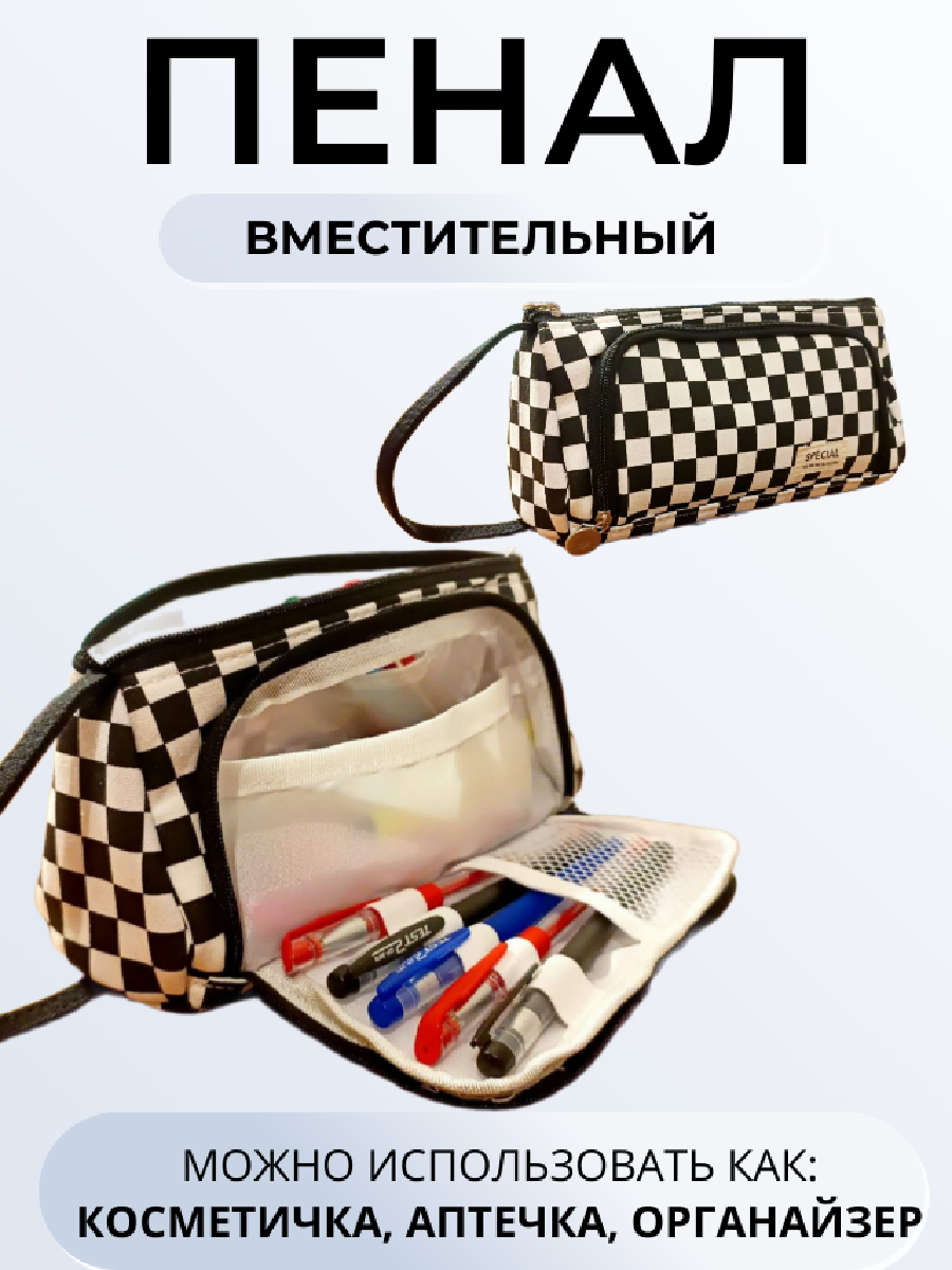 Пенал-косметичка школьный в клетку для девочек, студентов, аптечка, дорожная сумочка, цвет черный в белую клетку интересное:
