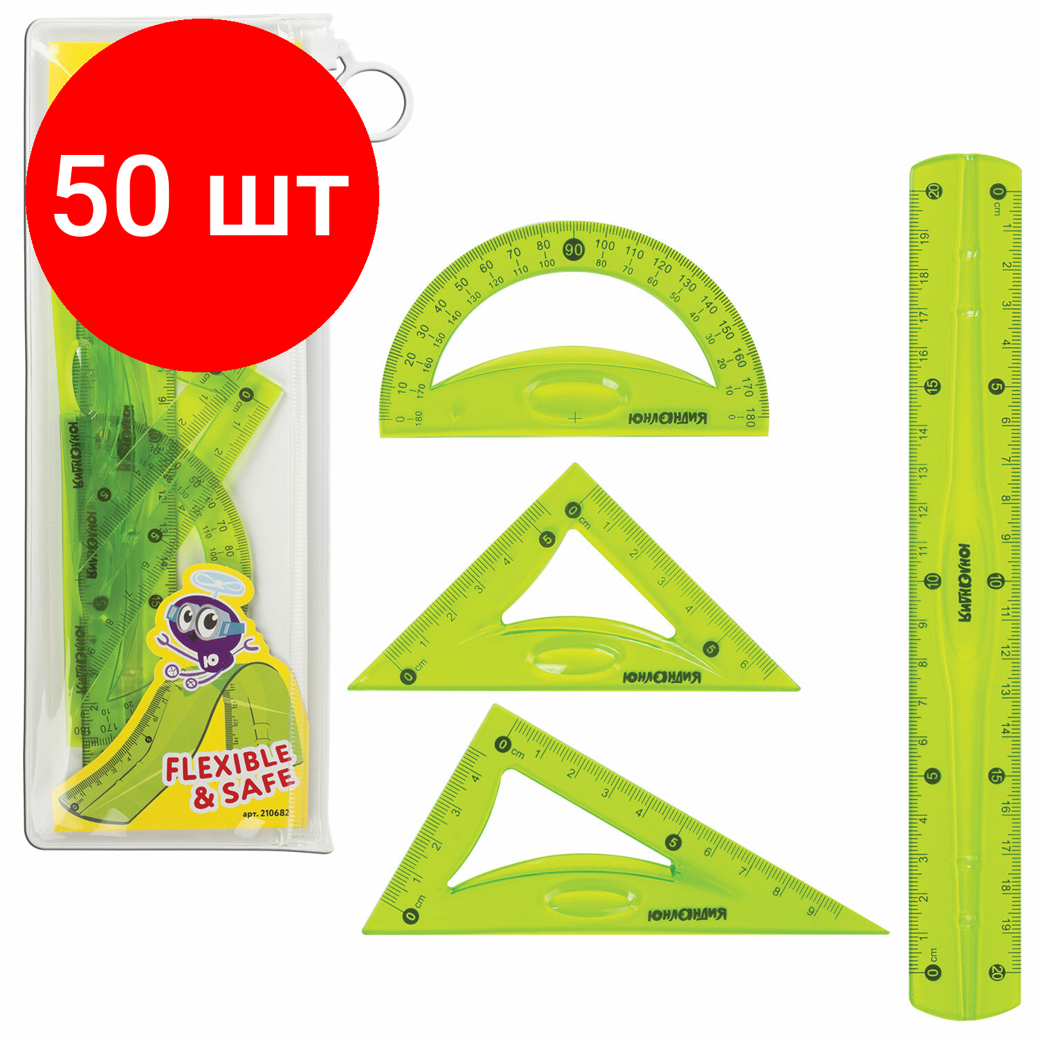 Купить Комплект 50 шт, Набор чертежный средний гибкий юнландия "FLEX" (линейка 20 см, 2 треугольника, транспортир), пенал, 210682