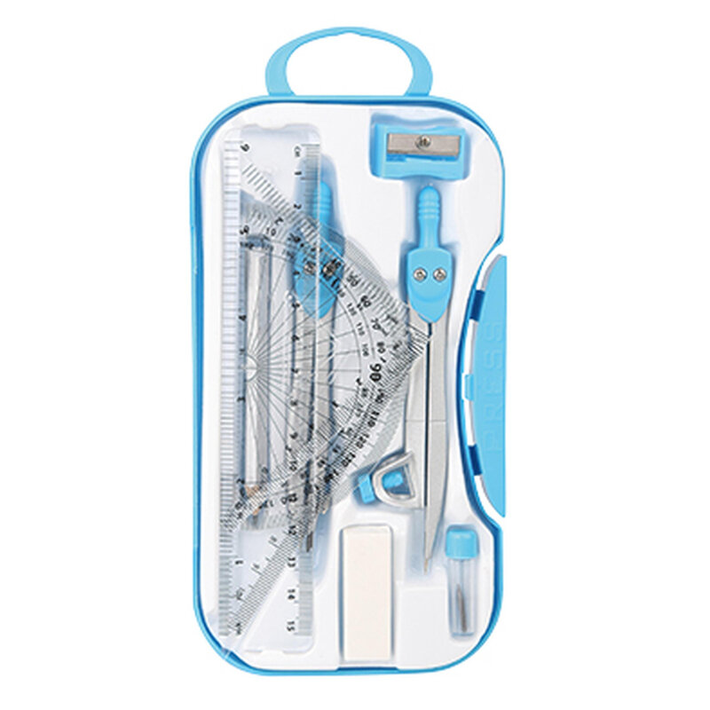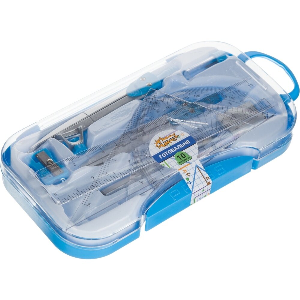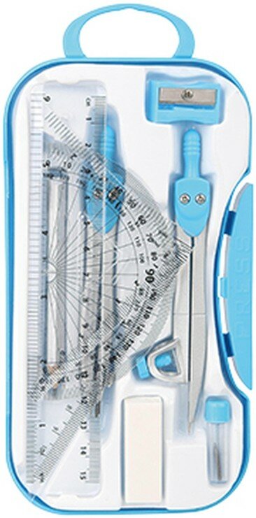 | Комплектация | Циркуль — 2 шт. Запасной грифель Линейка — 1 шт. Треугольник — 2 шт. Транспортир — 1 шт. Карандаш — 1 шт. Точилка — 1 шт. Ластик — 1 шт. |