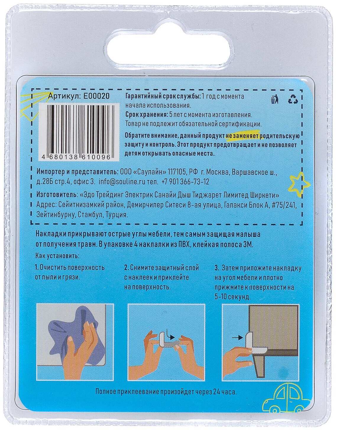 | Комплектация | 4 силиконовых уголка, скотч 3M. |