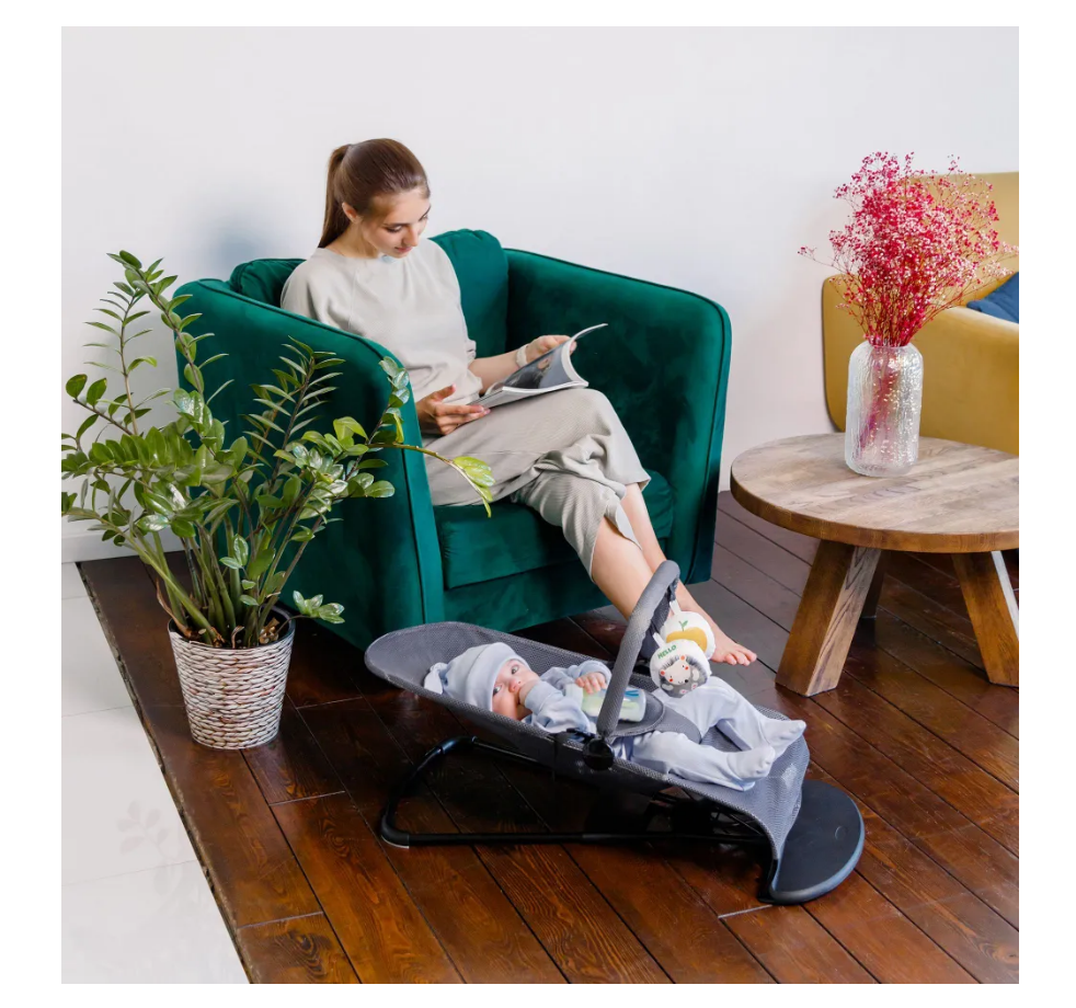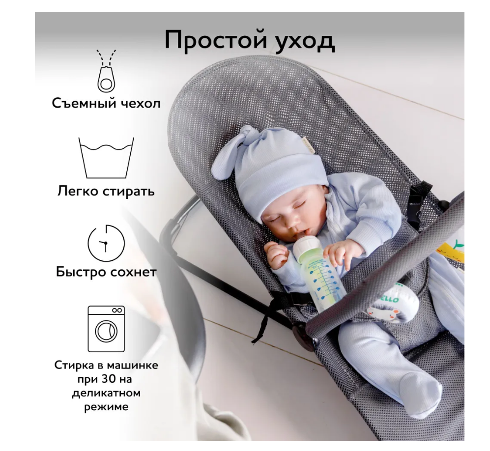 Ребенок в безопасности, стирается чехол и сохнет очень быстро, мобильный! Ребенок качается сам и играет! Находка для мам! |