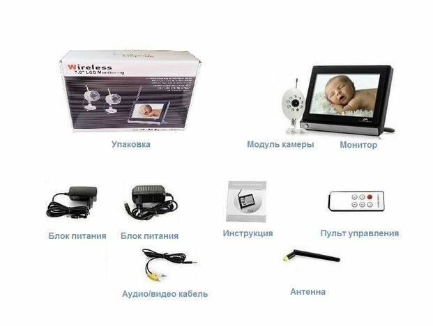 | Подробная комплектация | Комплектация: 1x Модуль видеоняни; 1х Монитор; 2x Блок питания с кабелем 12В; 1x Инструкция. |