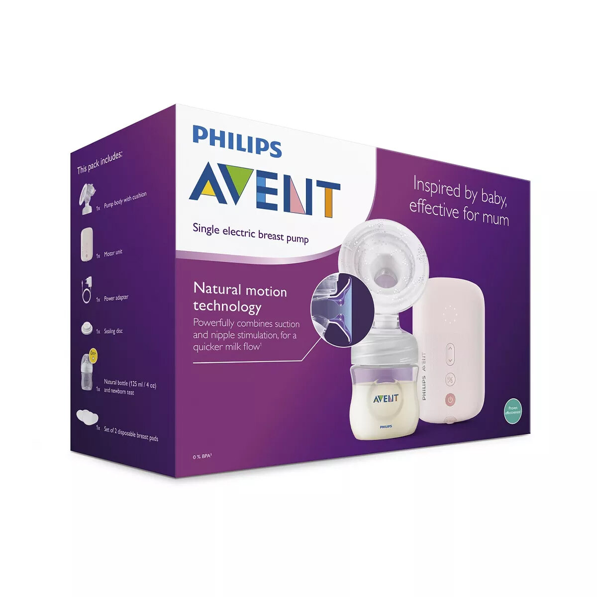 | Подробная комплектация | Бутылка 120 мл с соской 0м+, одноразовые прокладки для груди (2 шт.), набор для экспрессии, моторный блок, уплотнительный диск, блок питания |