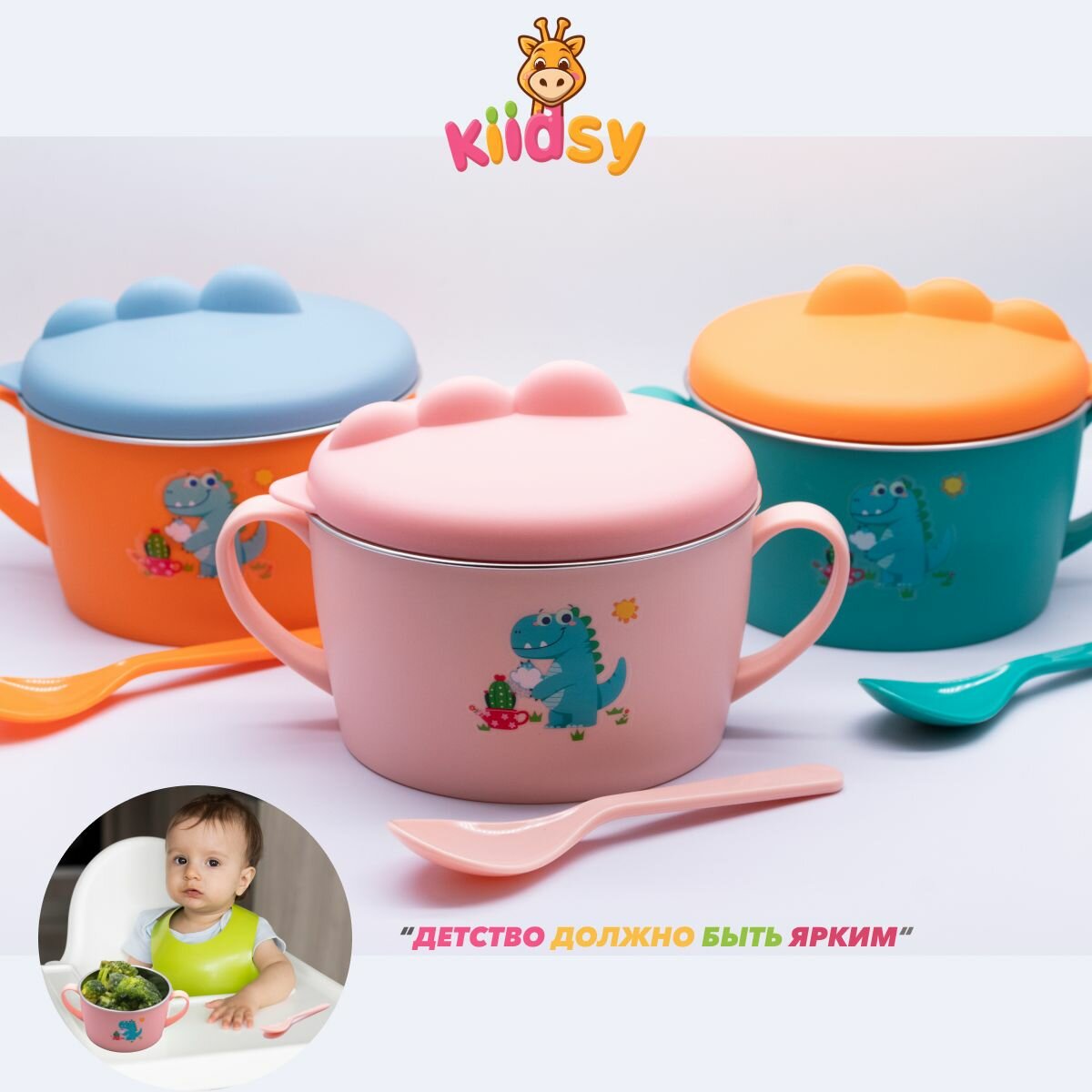 Купить Тарелка для малышей глубокая с крышкой и ложкой Kiidsy, 400мл