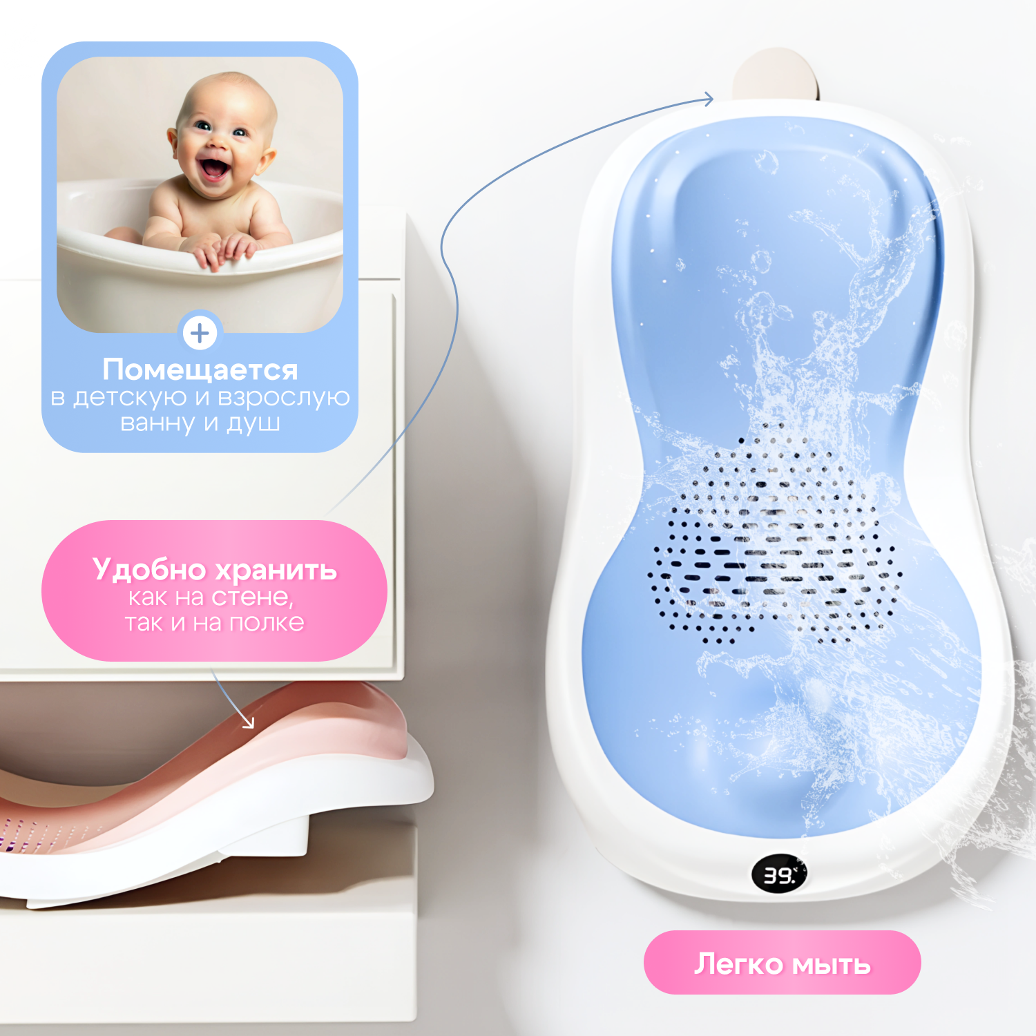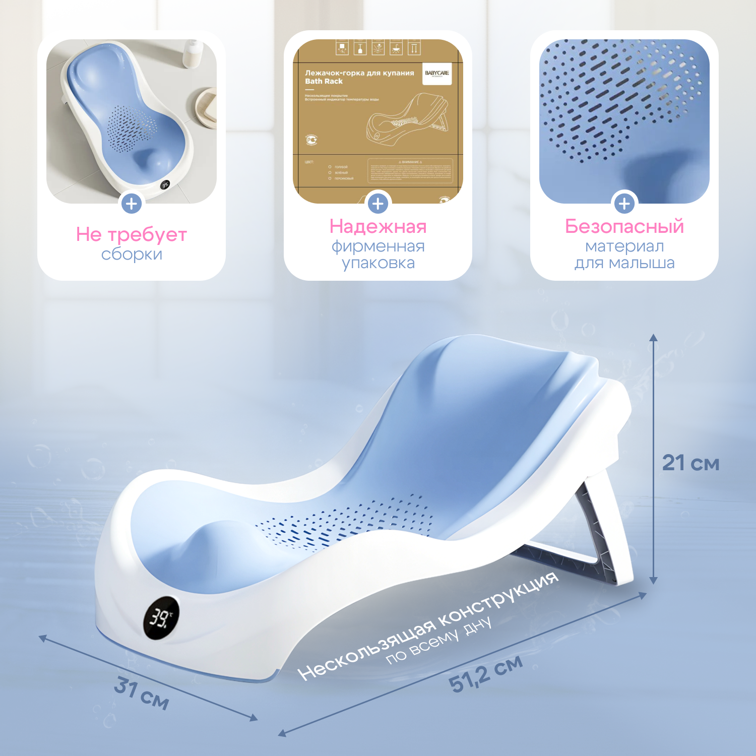 Лежачок-горка для купания Babycare с датчиком температуры, синий цвет интересное: