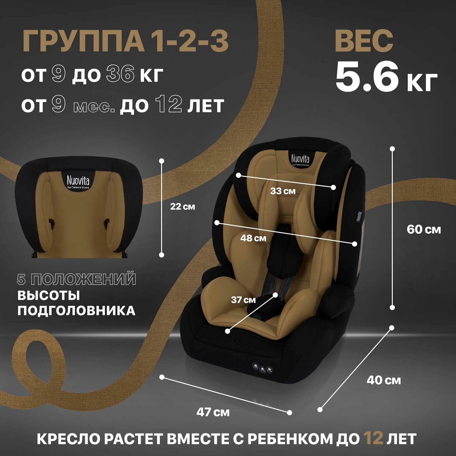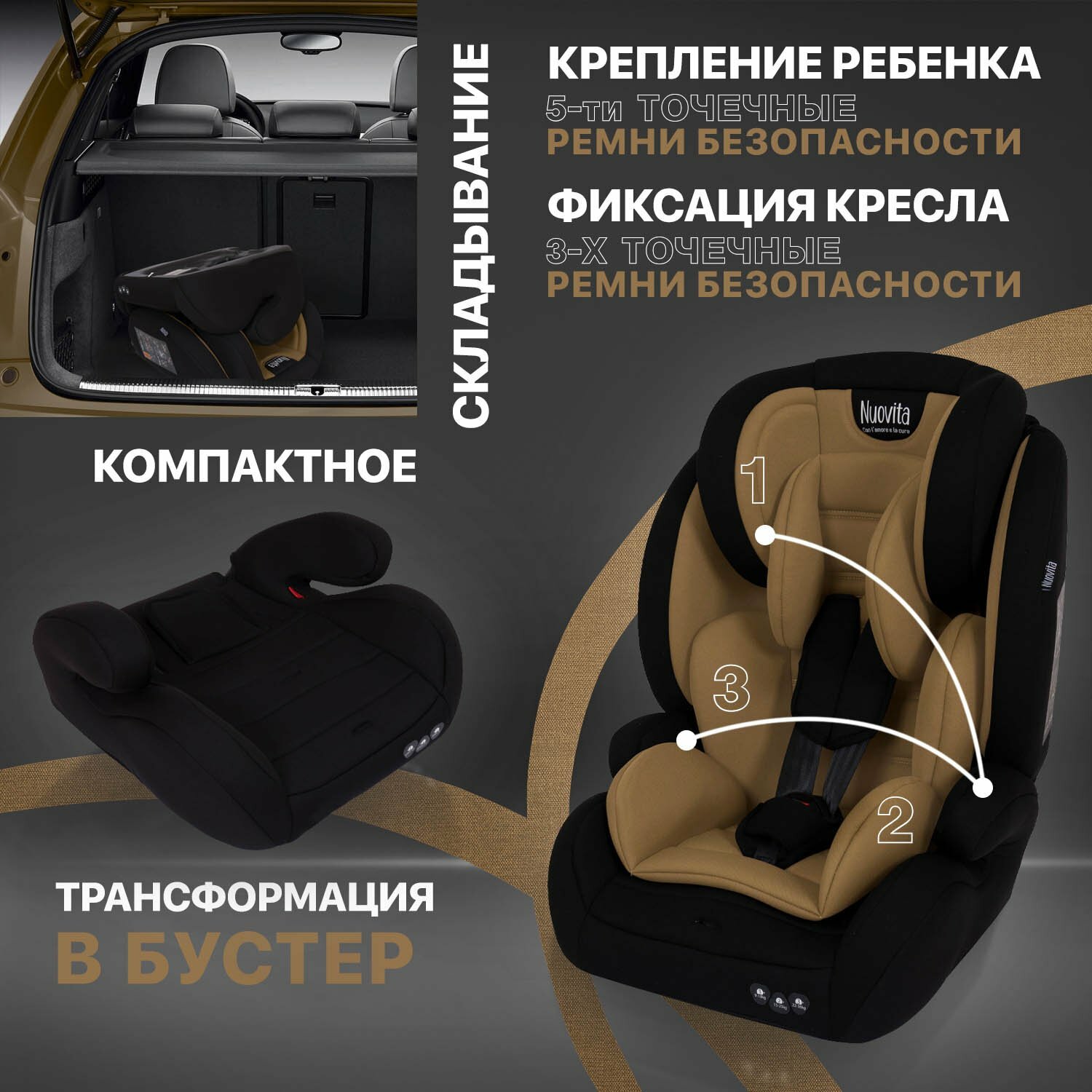 Автокресло детское Nuovita Maczione N123-1, группа 1/2/3, от 9 мес до 12 лет, весом от 9 до 36 кг/ трансформируется в бустер (Beige/Бежевый)