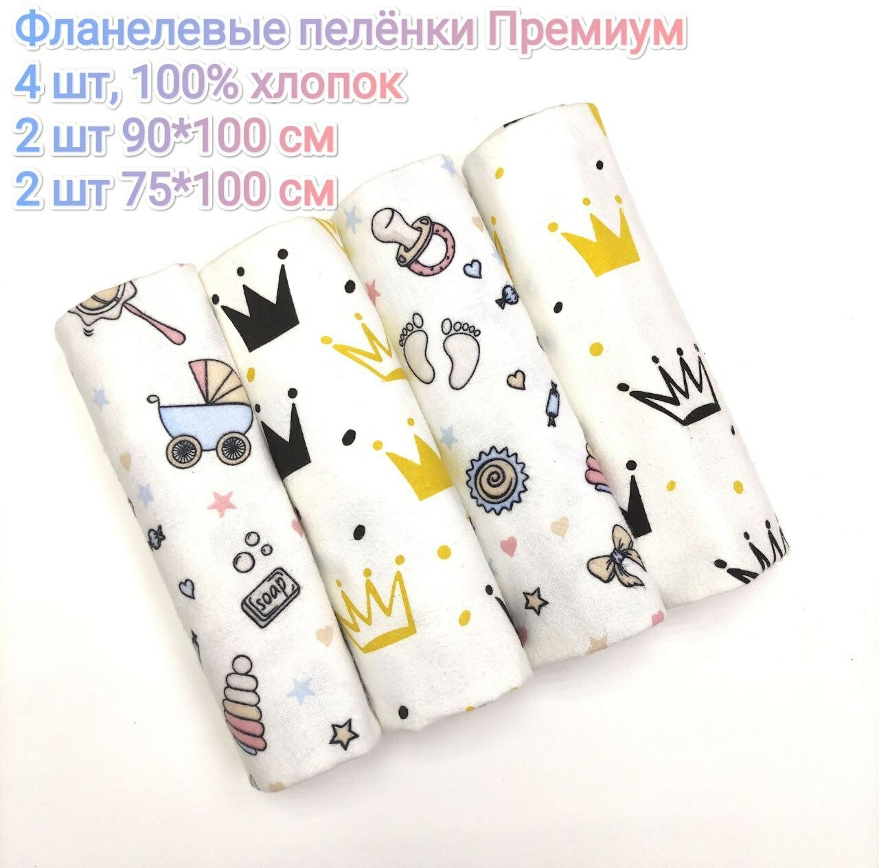 | Дополнительная информация | Комплект из 3 штук теплых текстильных многоразовых детских фланелевых пеленок 2 шт белые и 1 шт желтая с различными детскими рисунками,размер пеленок 90*120 см -2 шт, 75*120 см -3 шт |