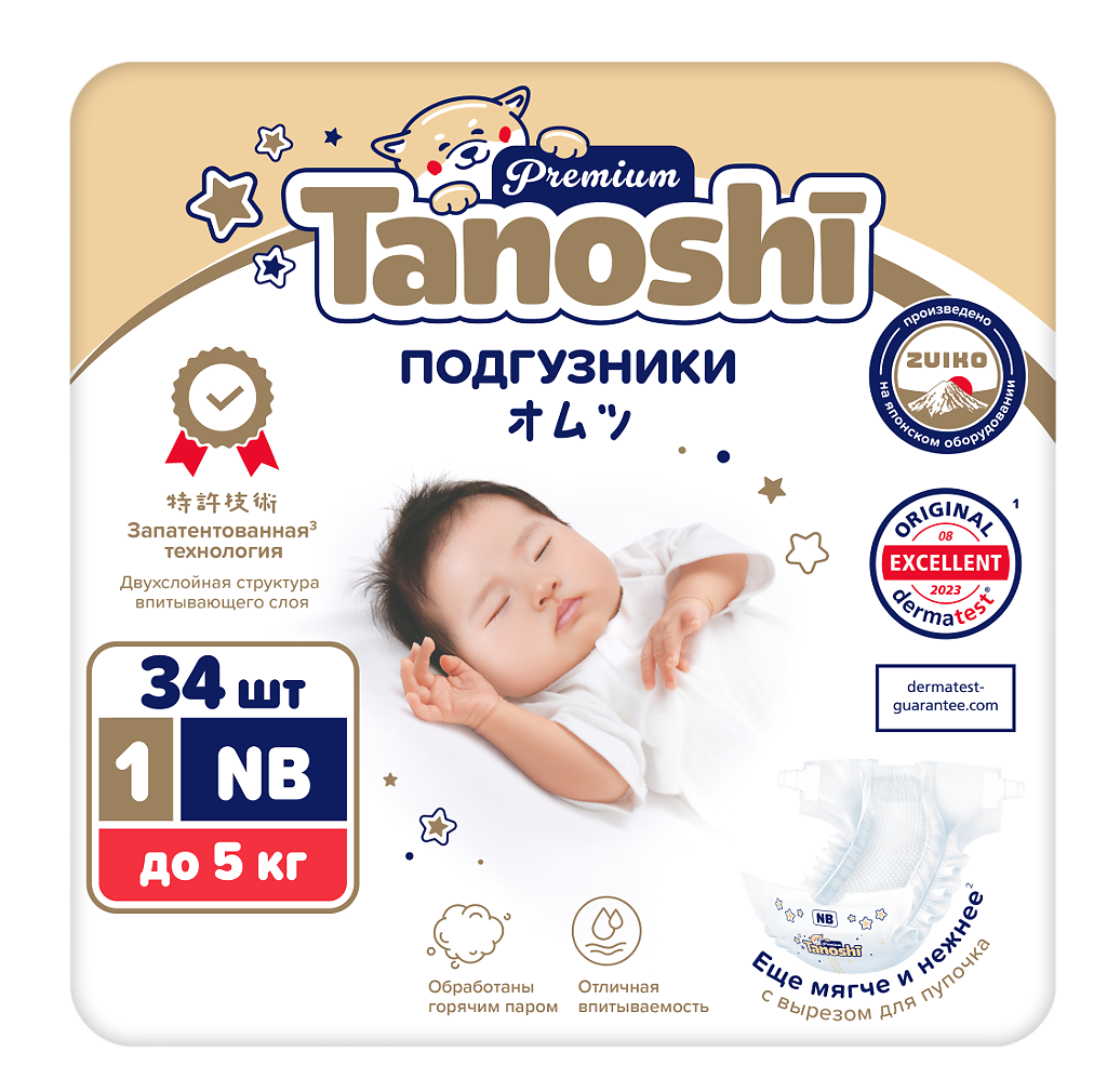 Купить Подгузники Tanoshi Premium, размер NB / 1 (до 5 кг) 34 шт, с вырезом под пупочек