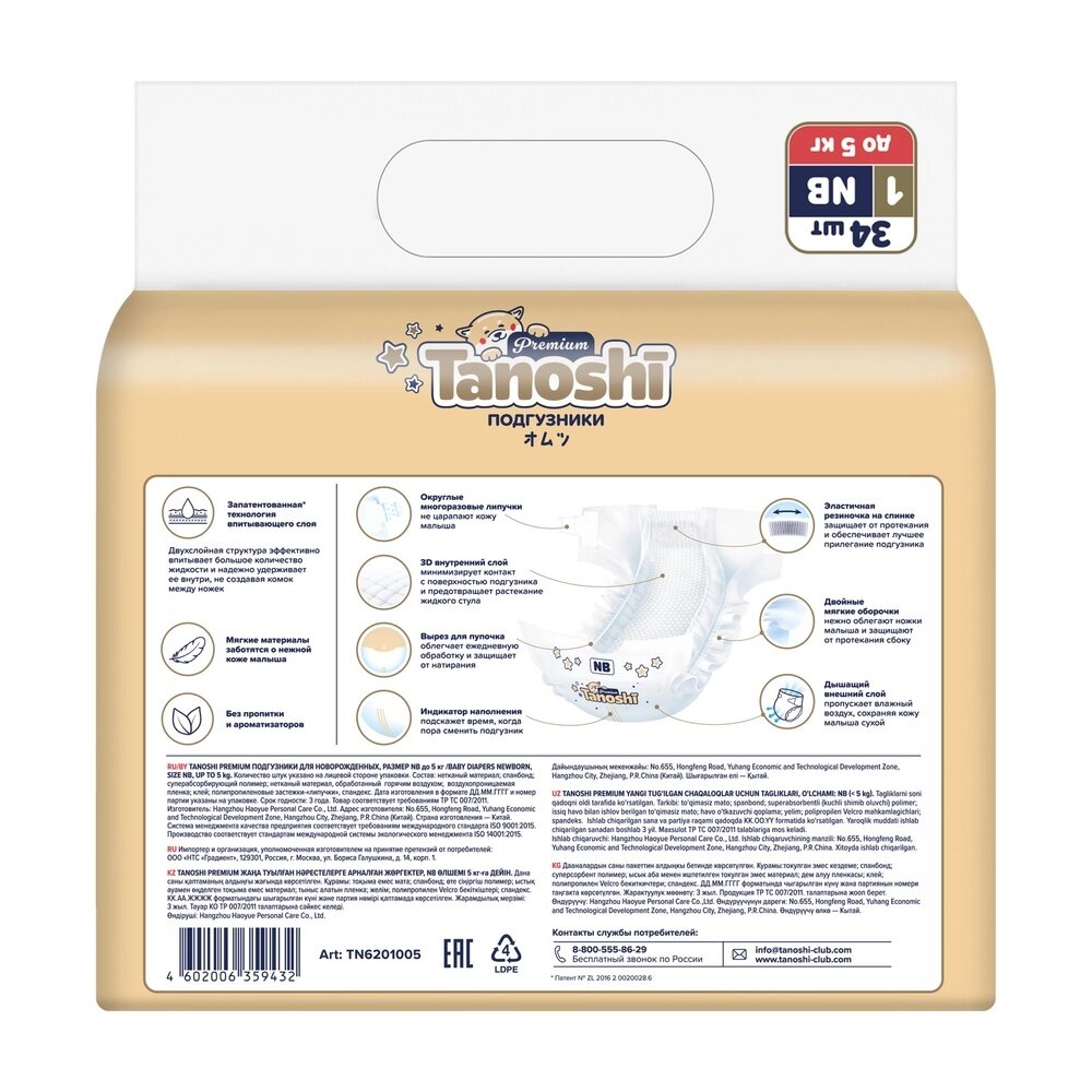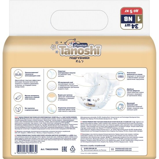 Подгузники Tanoshi Premium, размер NB / 1 (до 5 кг) 34 шт, с вырезом под пупочек интересное: