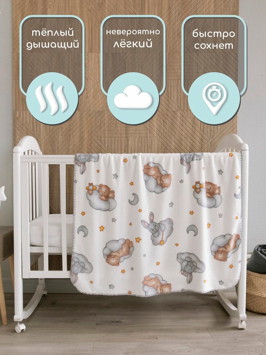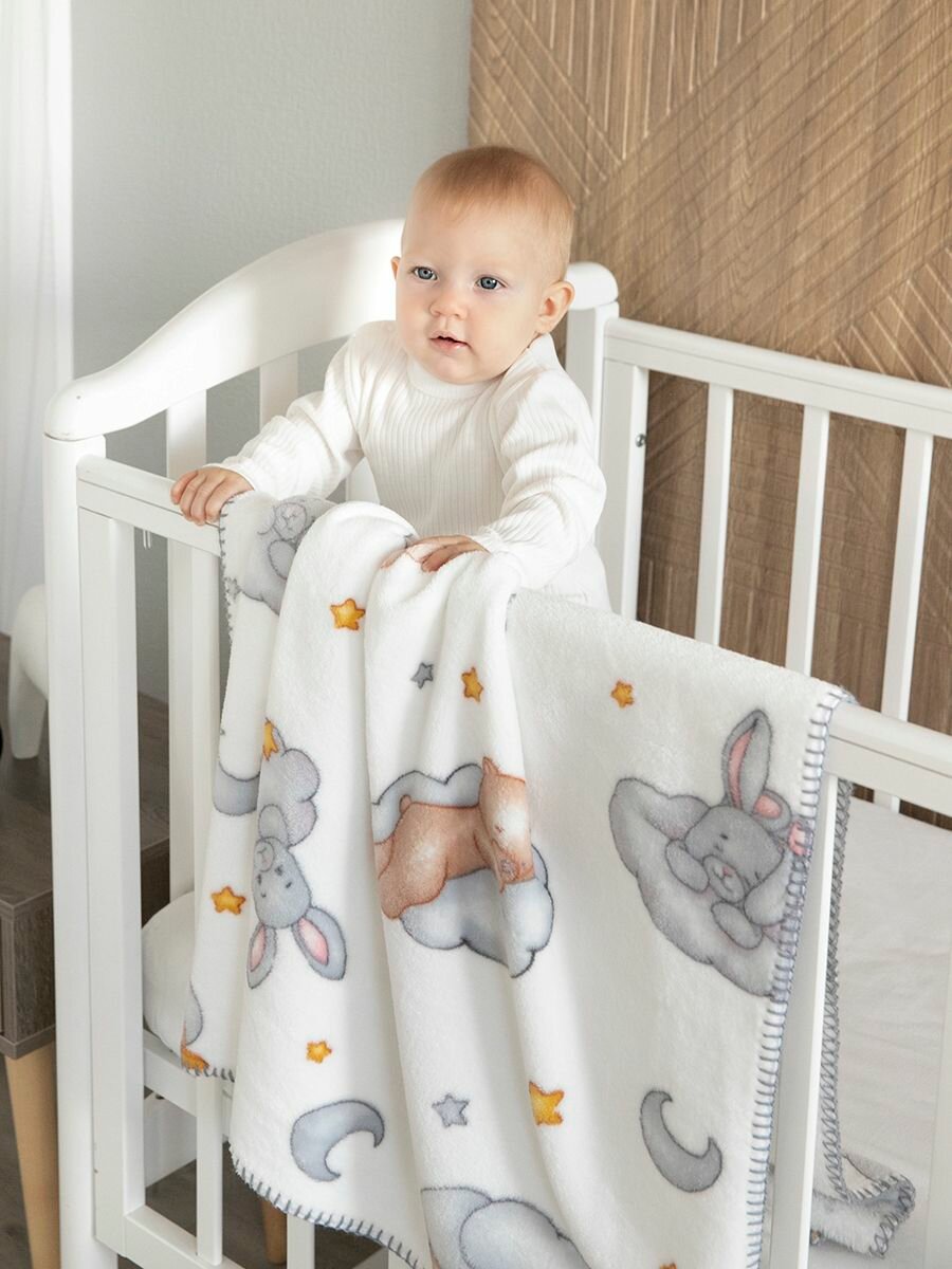 Плед для новорожденных плюшевый 100х118 см. Плед детский мягкий, теплый в кроватку, коляску "Зайки на белом" Baby Nice