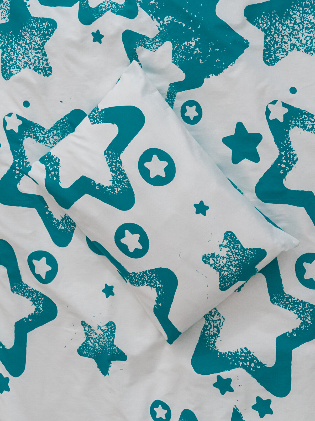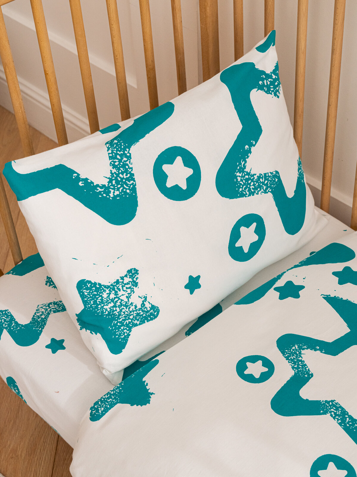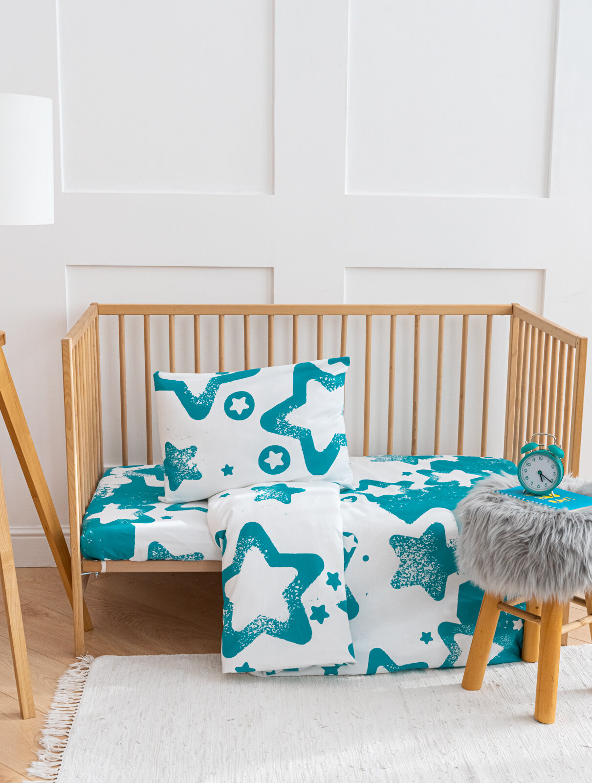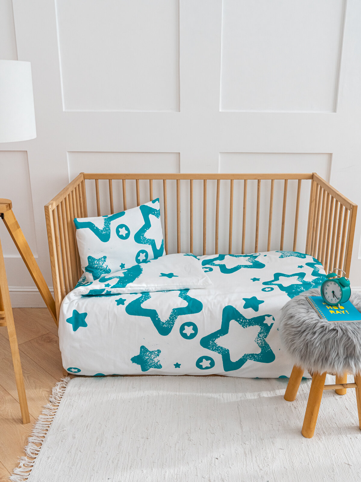 Детское постельное белье в кроватку Звезды на бирюзовом бязь 3 предмета с 1 нав. 40х60