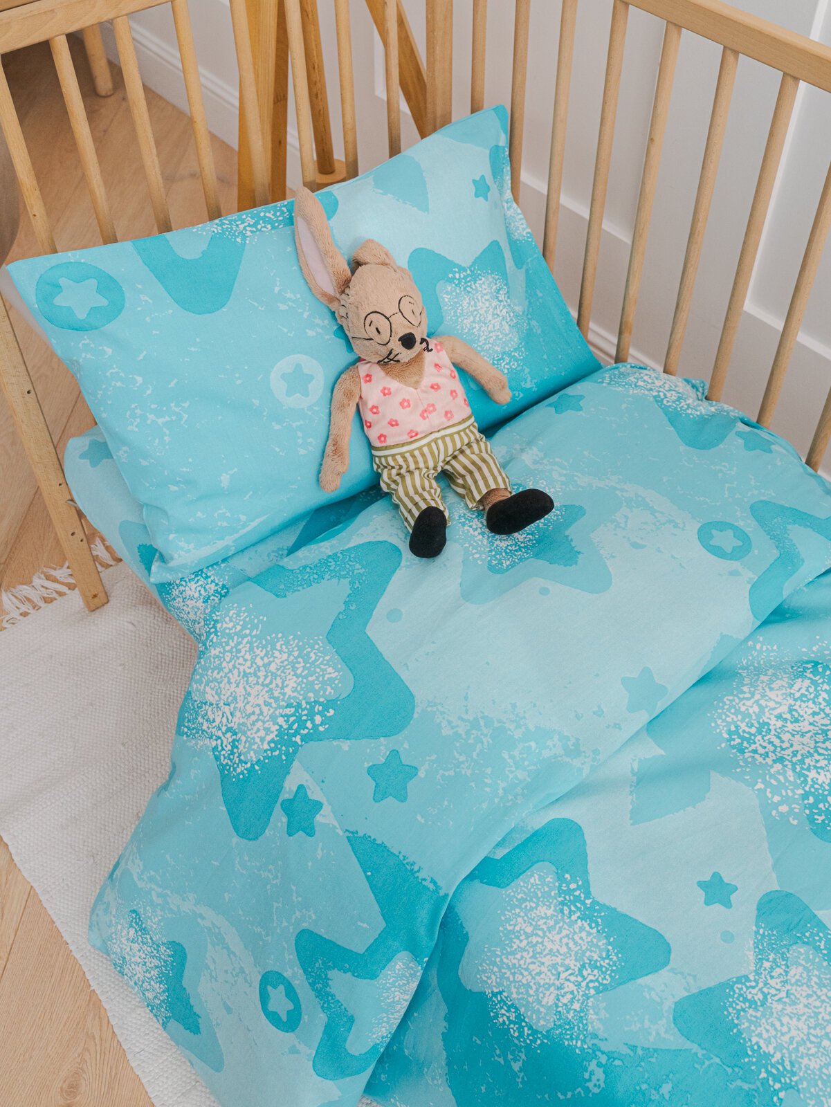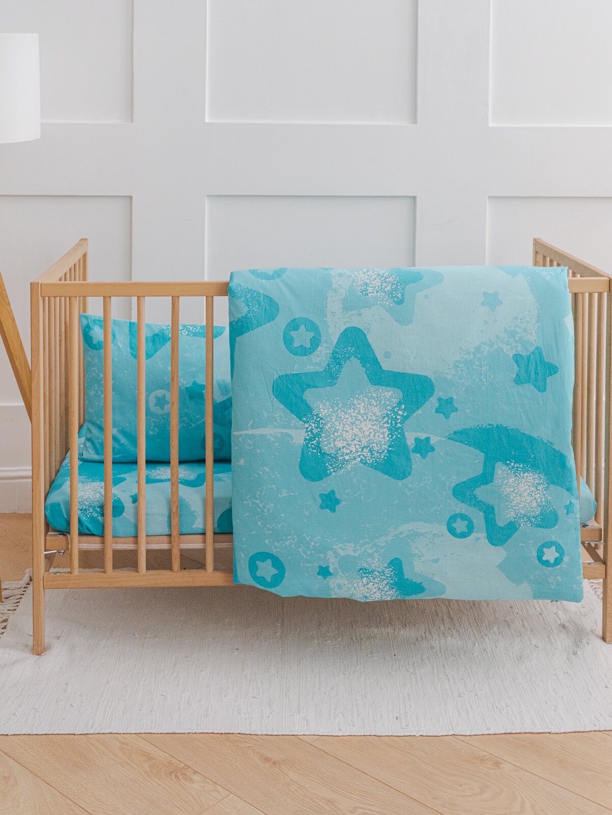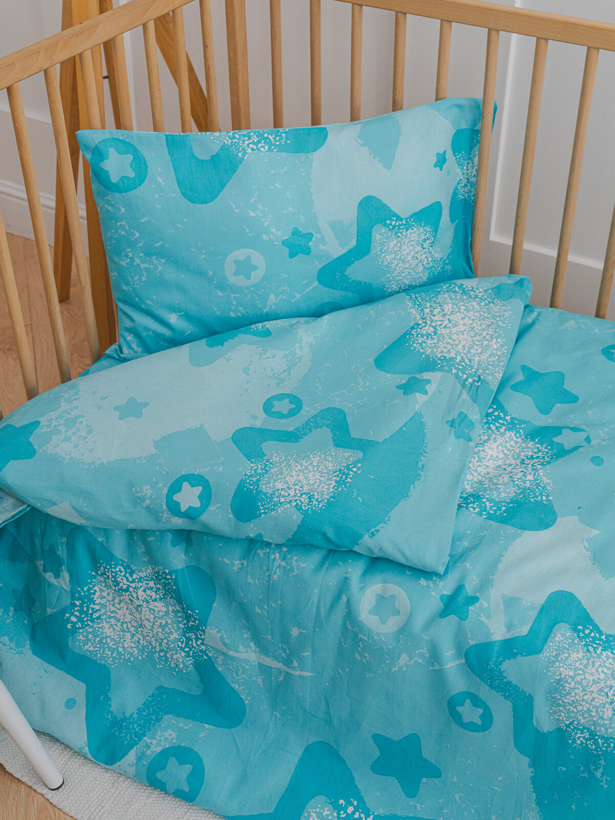 Купить Детское постельное белье в кроватку Звезды на бирюзовом бязь 3 предмета с 1 нав. 40х60