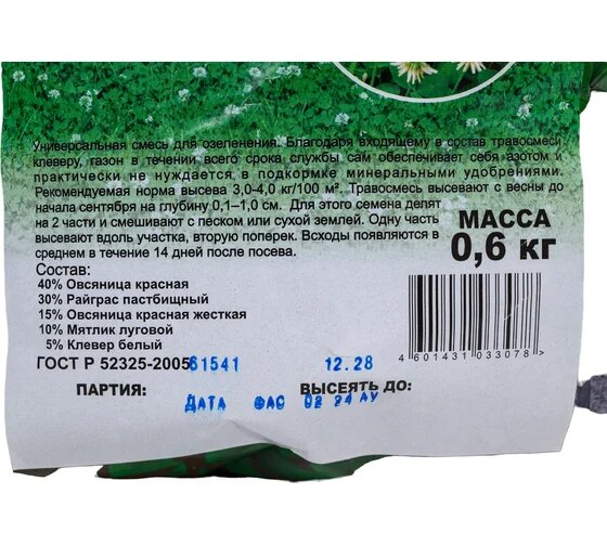 | Состав смеси | Овсяница красная - 40%, Райграс пастбищный - 30%, Овсяница красная жесткая- 15%, Мятлик луговой - 10%, Клевер белый - 5% |