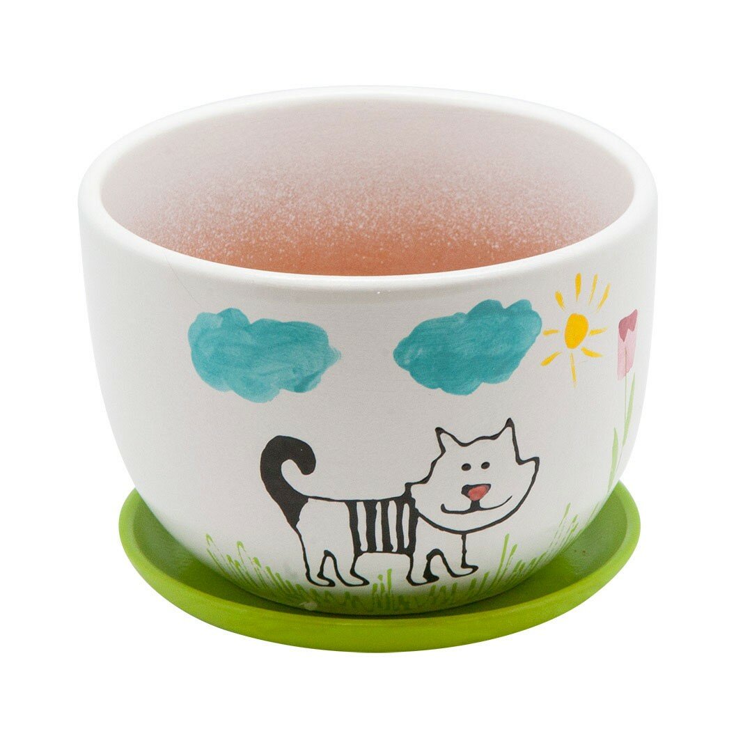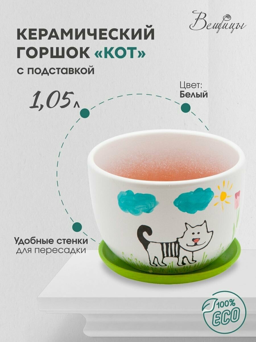 Купить Керамический горшок цветочный ВеЩицы "Кот" с подставкой блюдцем / Горшок для цветов с поддоном / Горшок для растений / 14,8х14,8х10 см, объем 1,05 л, цвет белый с рисунком