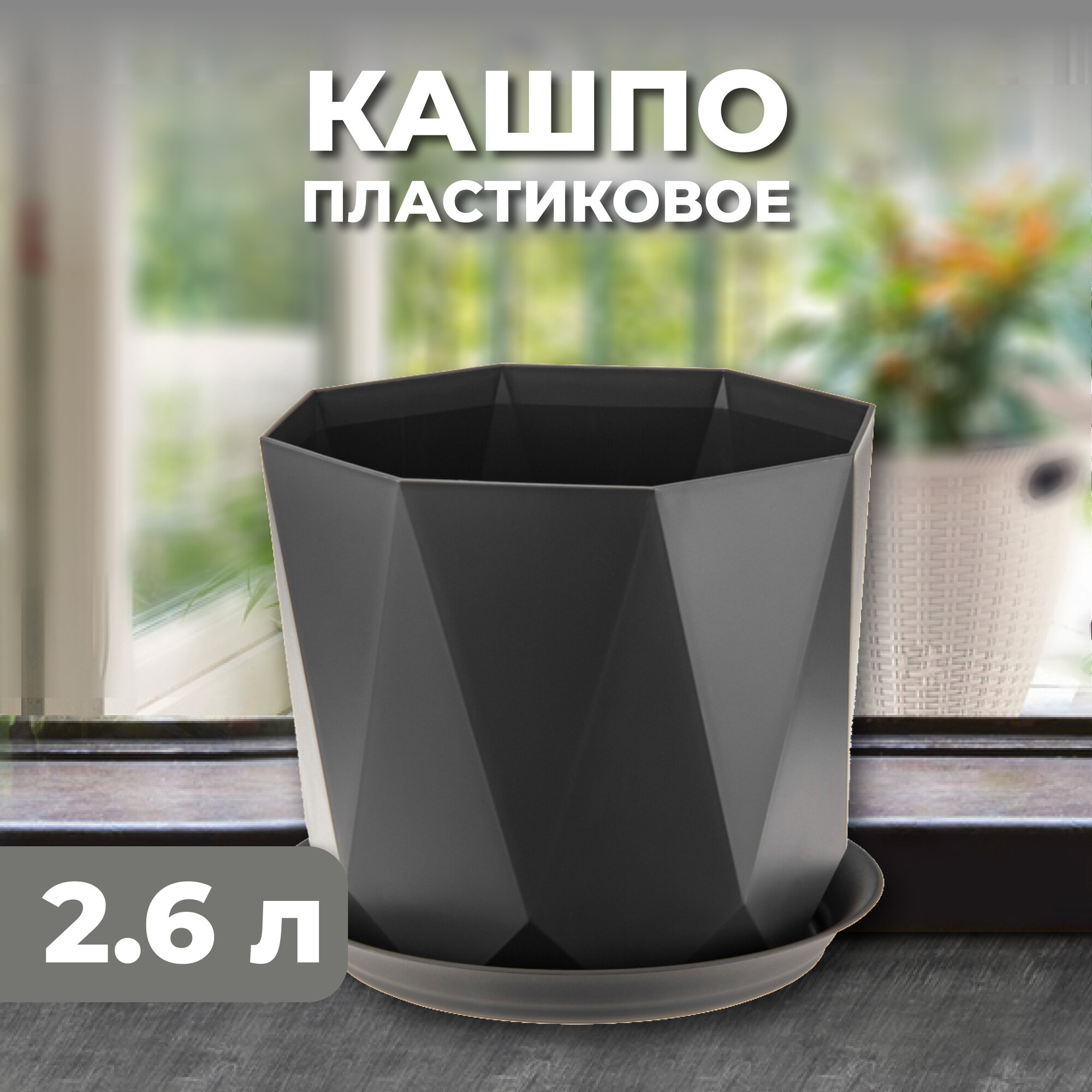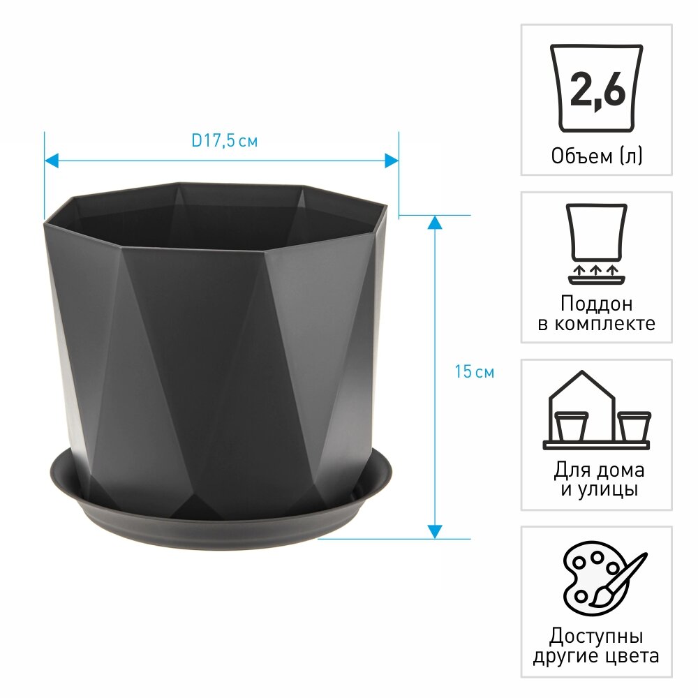 Горшок для цветов с поддоном «Призма», 2.6 л, пластиковый, графитовый