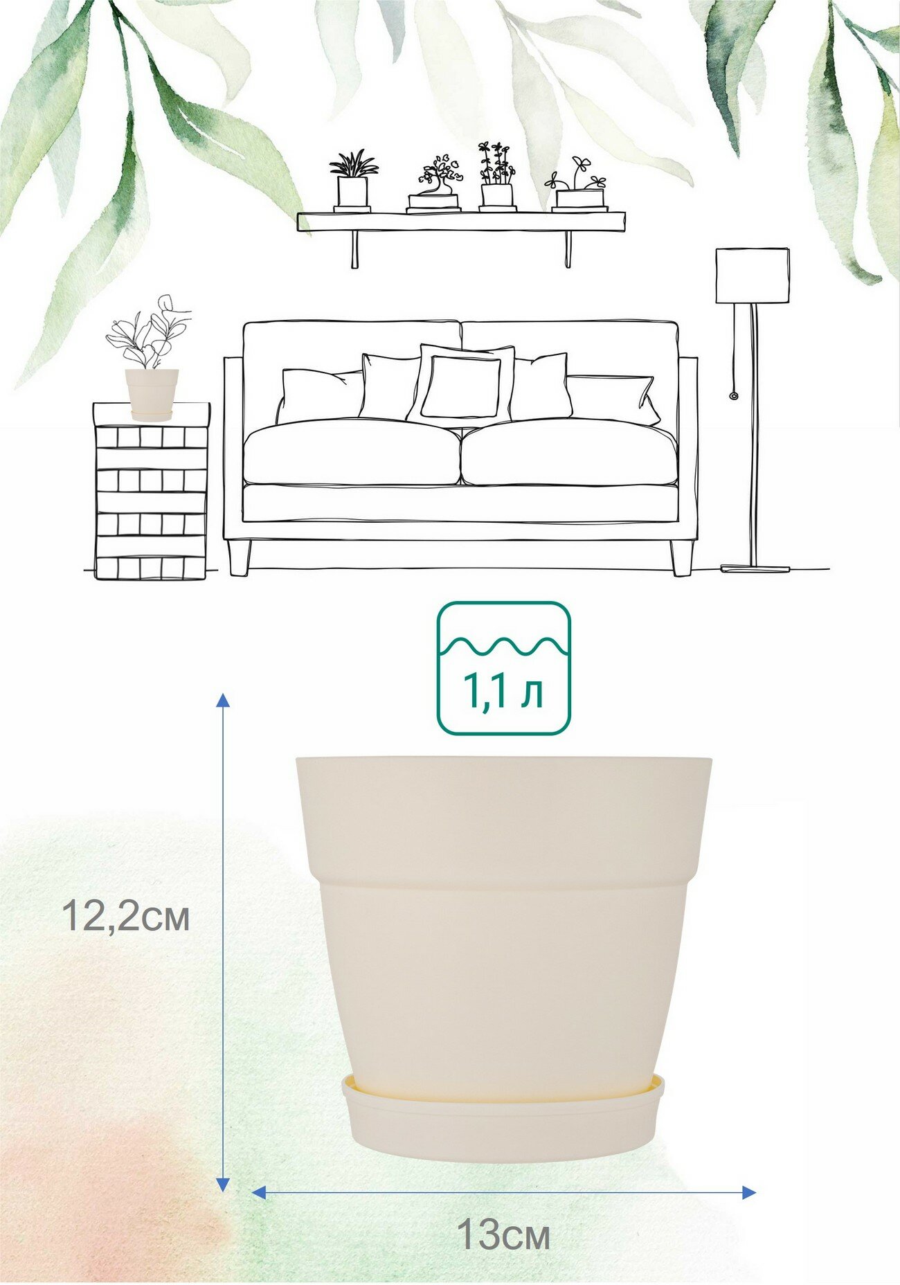 Горшок для цветов 0,65л (ДхШхВ) 11,5х11,5х10,4 см с дренажной сеткой и съемным поддоном, горшок пластиковый, кашпо для цветов уличное