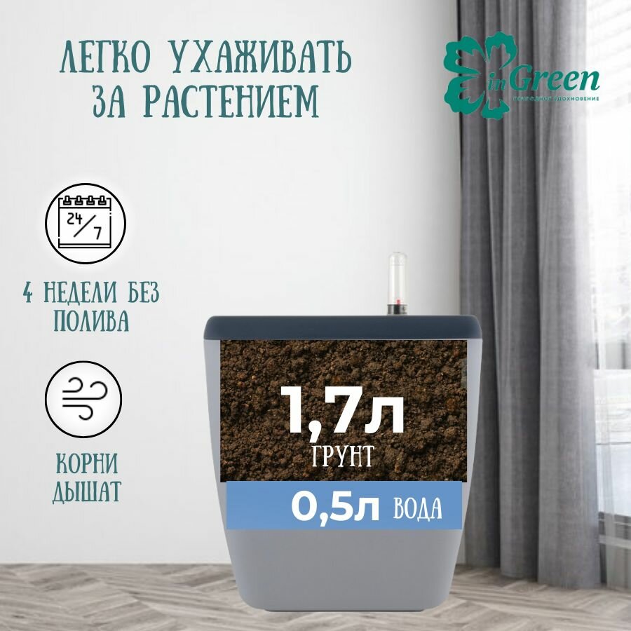 Горшок с автополивом InGreen Munchen 1,5л 0,85л, квадратный, вулканический сер