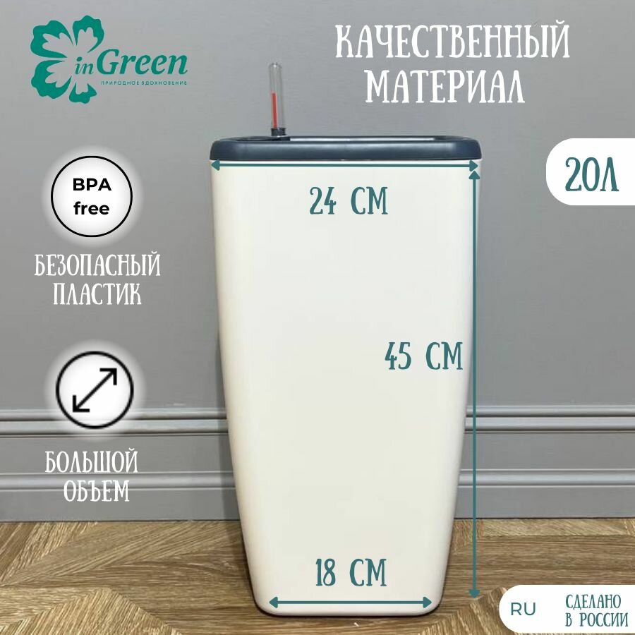 Горшок с автополивом InGreen коллекция Munchen, 20 л., квадратный , с внутренней вставкой 8 л, белоснежный жасмин , 24 х 24 х 46 см